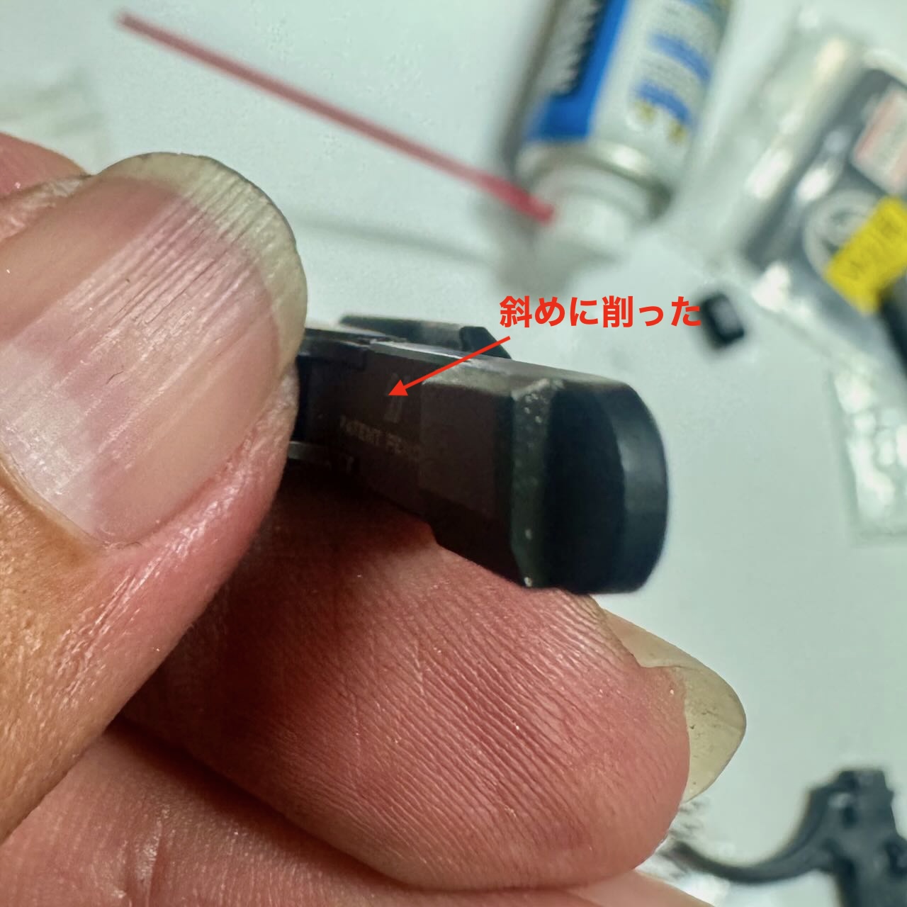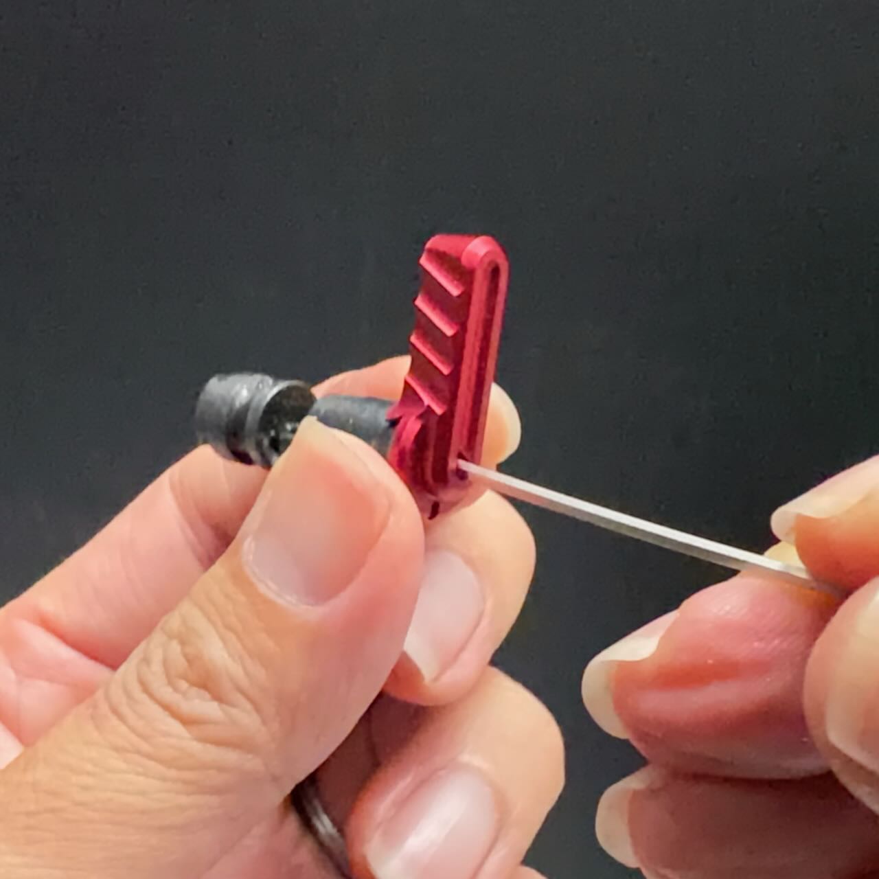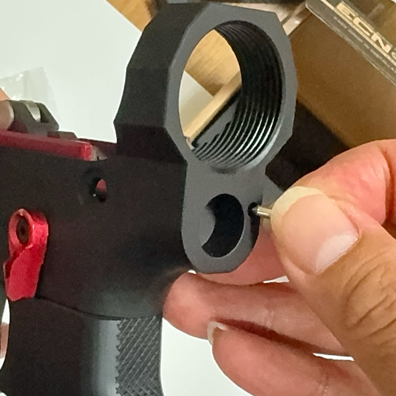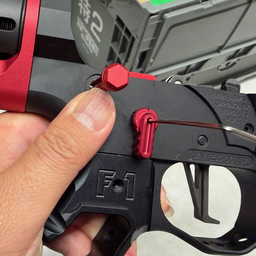 一方のStrike Industriesのピボットピンの頭はかっちょいい台形をしているので、レシーバーの出っ張り(写真の赤いところ)を削らないと入らない。ので、削る。金工ヤスリでガリガリ削って細目のヤスリで仕上げる。