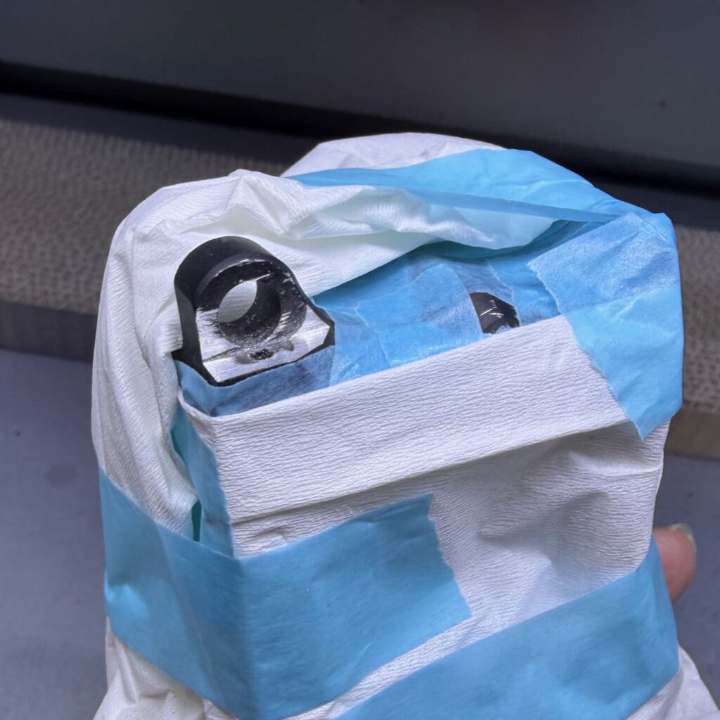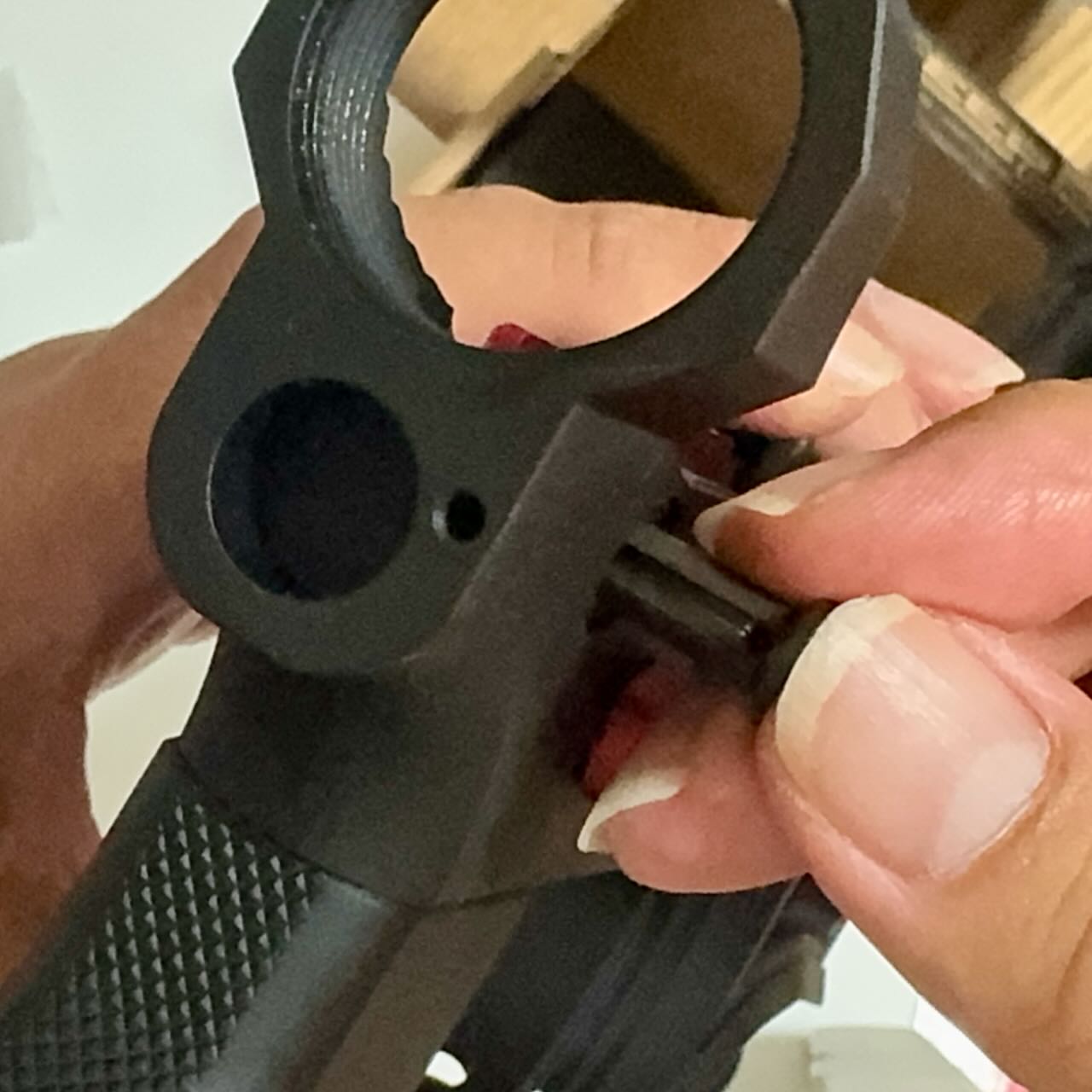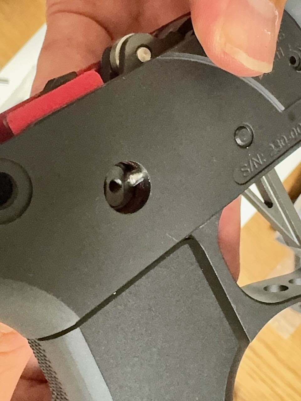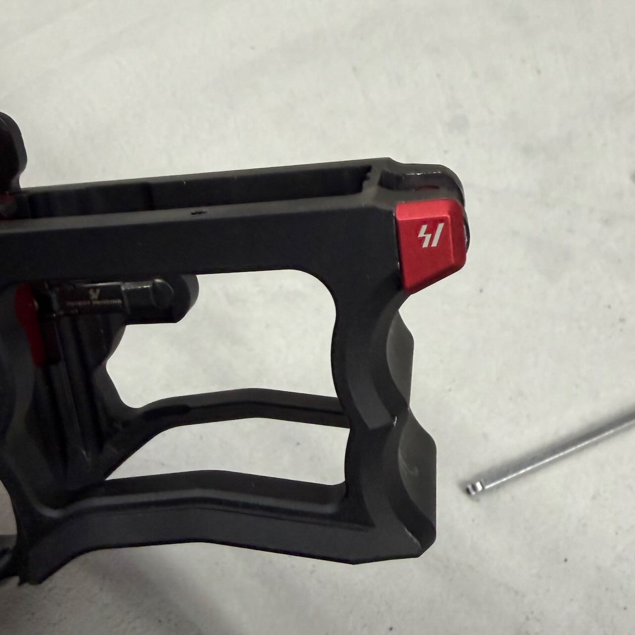 一方のStrike Industriesのピボットピンの頭はかっちょいい台形をしているので、レシーバーの出っ張り(写真の赤いところ)を削らないと入らない。ので、削る。金工ヤスリでガリガリ削って細目のヤスリで仕上げる。