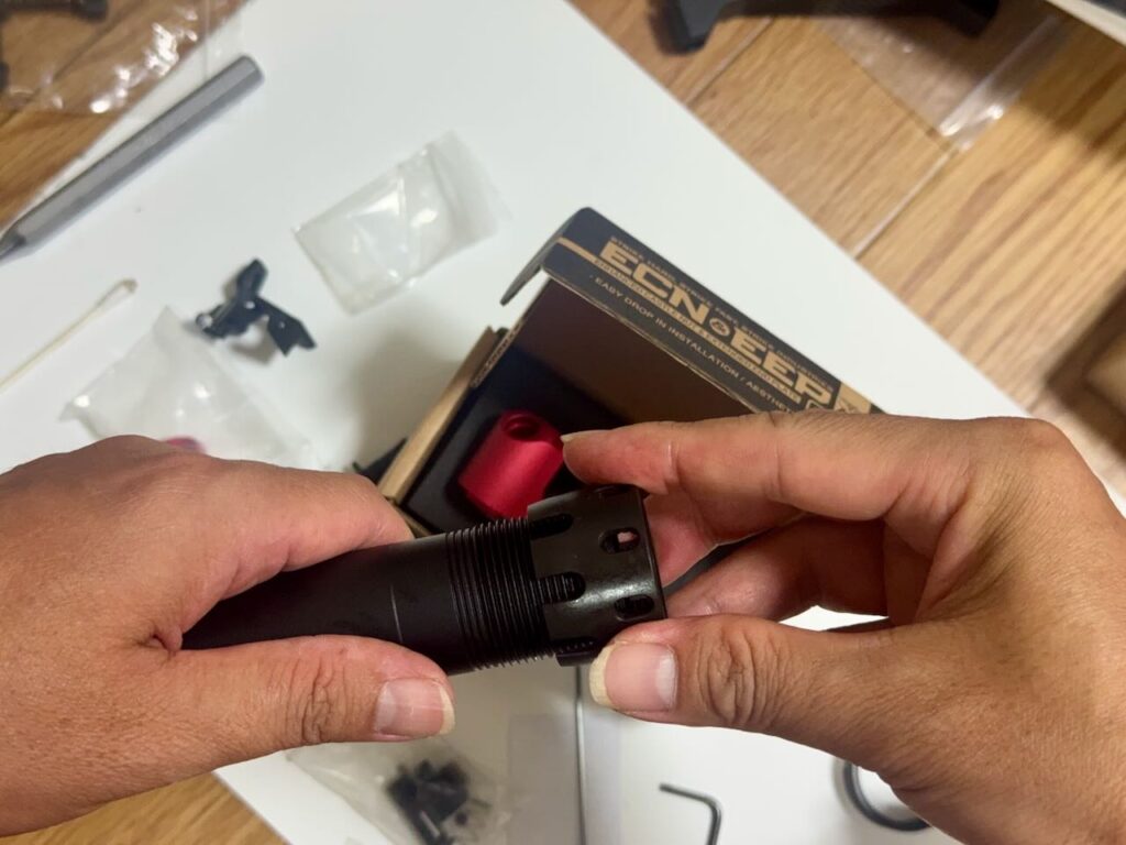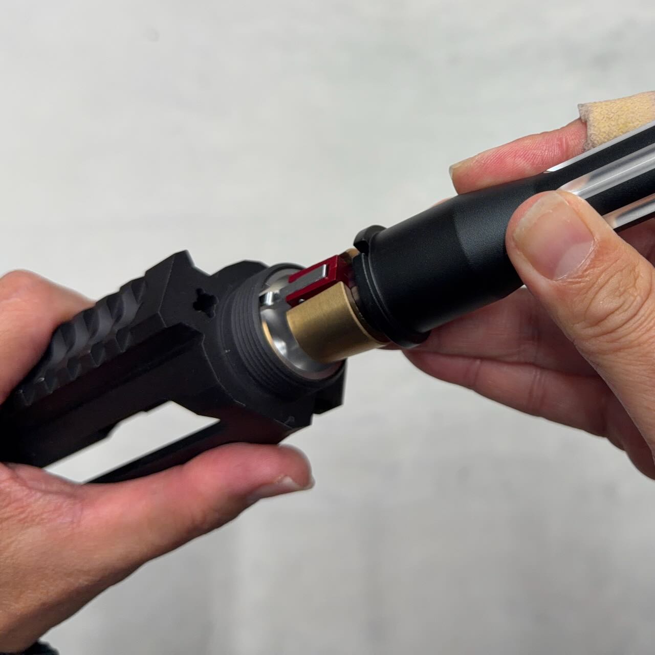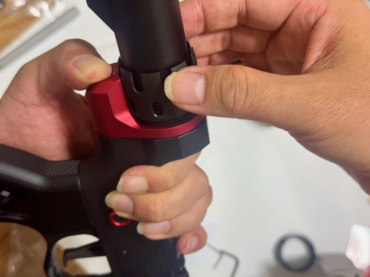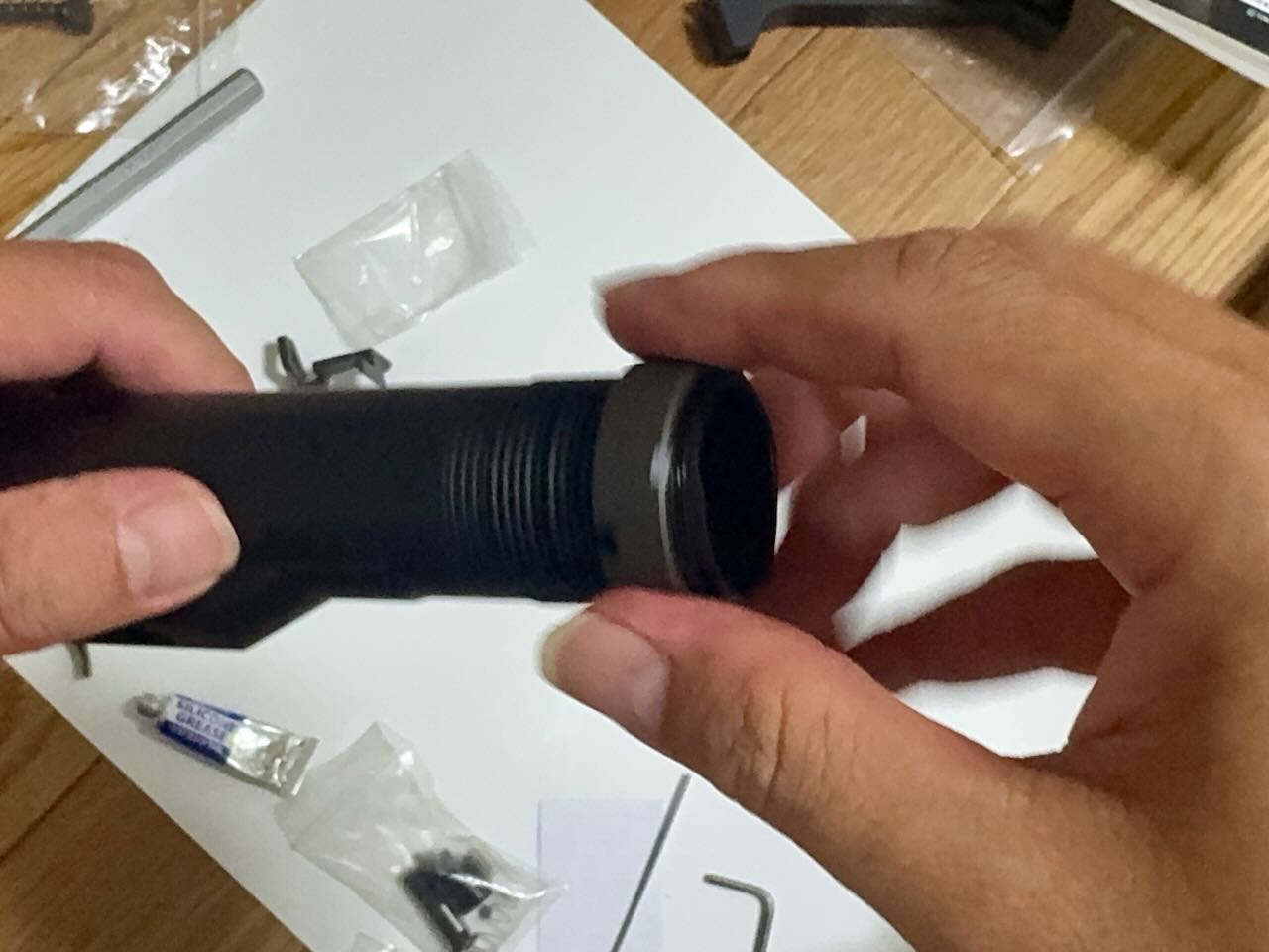 以前、バッファーチューブをカスタムパーツにしたときは、太さが微妙に合わずにバッファーチューブのネジ山を金工ヤスリで削って、ネジ溝をネジヤスリで掘り下げるというすり合わせが必要だったけど、今回は無問題。なんか順調すぎて怖い。