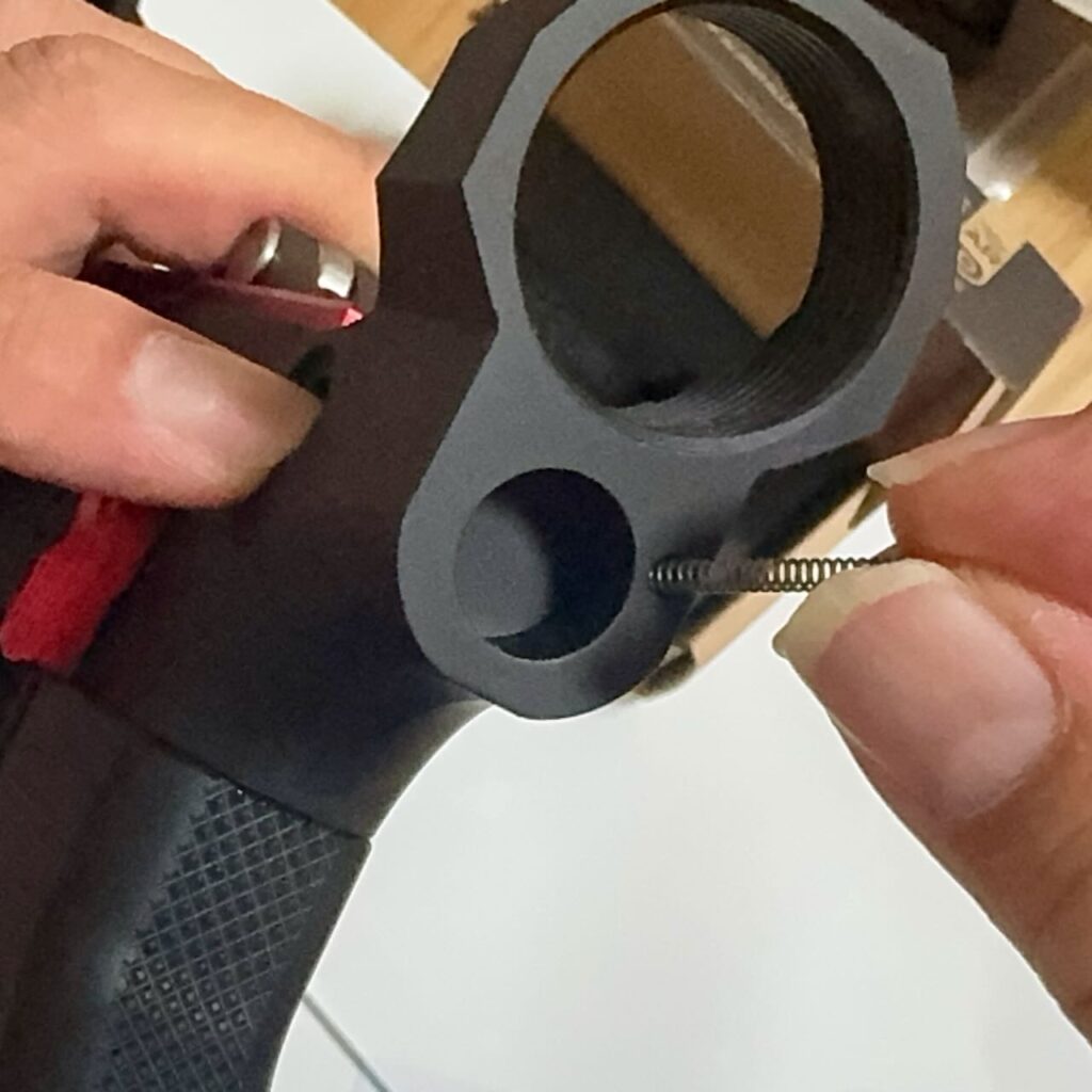 レシーバー付属のスプリングとバッファーストッパーを所定の位置に入れる。バッファーチューブを入れるまではどこにも引っ掛かりがないからうっかりどこかへ飛んでいかないように注意。