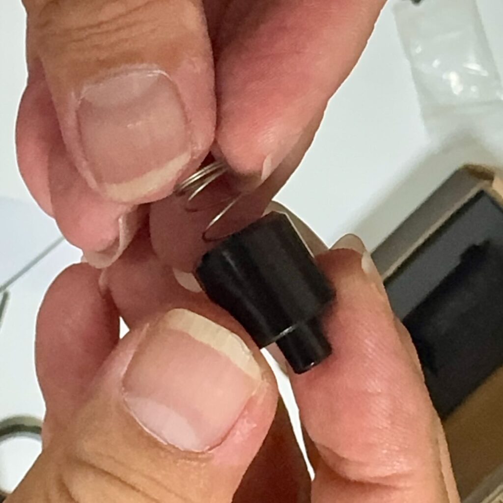 お道具箱の中から厚み1mmのOリングを発見。内径はちょっと大きい6mmだけどゴムだからグニュッと楕円にすれば問題なし。Oリングをかませて取り付け直したらマガジンの抜き差し快調。この部分はそのうちホームセンターでちょうどいいOリングかワッシャーを見つけてそれに替えよう。
