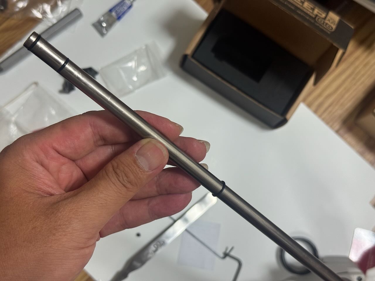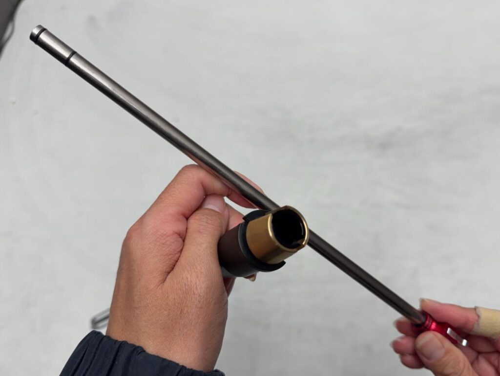 東京マルイ純正よりちょっと長めの G&P Φ6.03 タイトインナーバレル 282mm チャンバーパッキン付。アウターバレル内でのガタつきを防ぐ前方のOリングが2カ所ある。その2ヶ所の溝に付属のOリング(小)をはめる。もうひとつのOリング(小)はあとで使うのでいったん中央付近に留めておく。