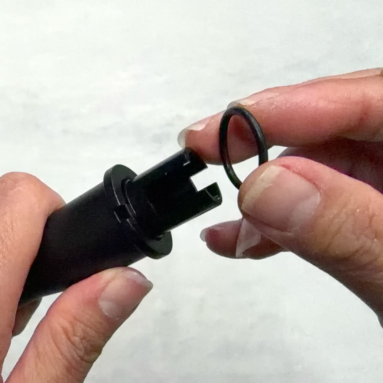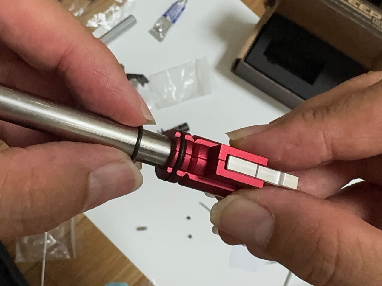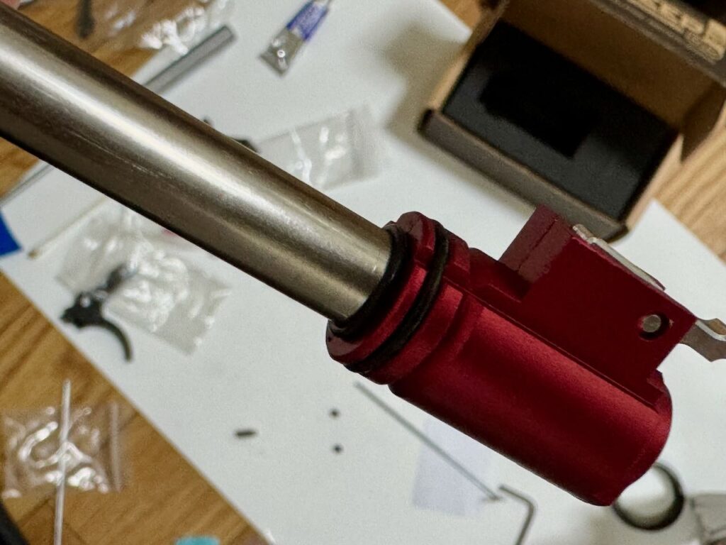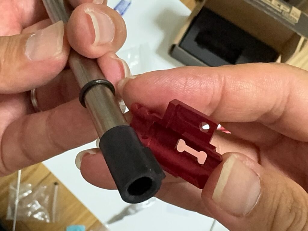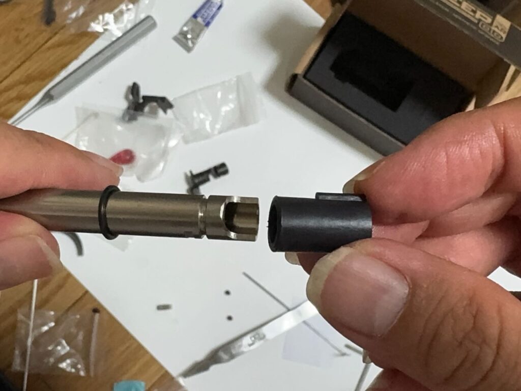先に組み上げたインナーバレル一式を後方から差し込むが、結構キツくて無理に押し込んだせいで前方のOリングがちぎれてしまった。お道具箱から同じサイズのOリングを見つけて今度はOリングにシリコーングリスを塗ってから差し込んだ。最後はアウターバレル後方の凹みにホップチャンバーを合わせてきっちり奥まで入れる。