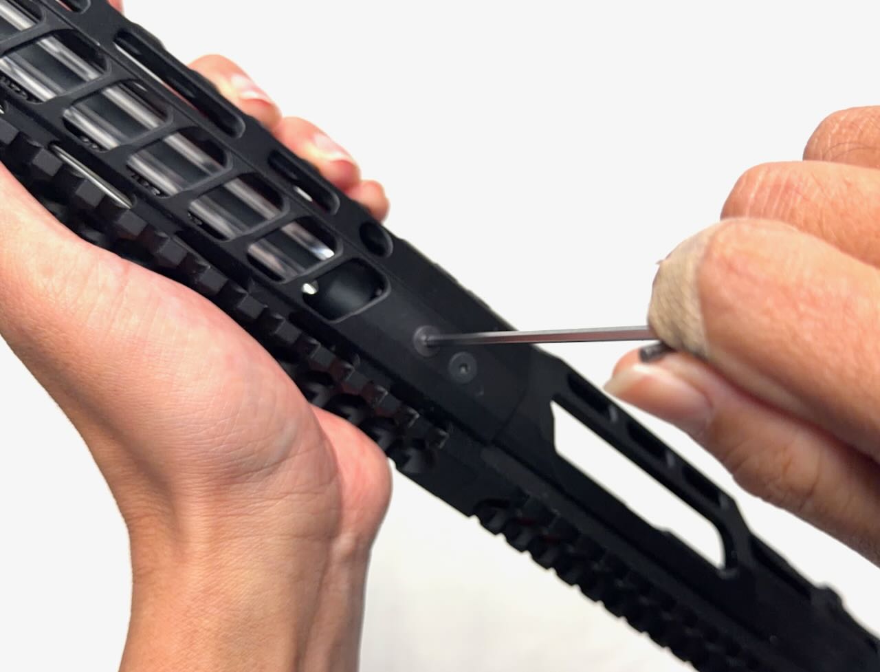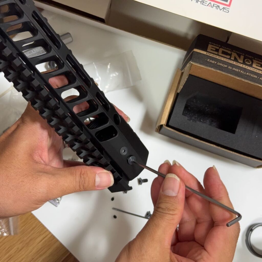 スケスケハンドガード IRON AIRSOFT F1 Firearms P7M AR-15 Hyper Lite タイプ ハンドガード 13.5インチ(リバーシブル バレルナット仕様)。ハンドガード後方にある8カ所のネジを外して中からバレルナットを取り出す。