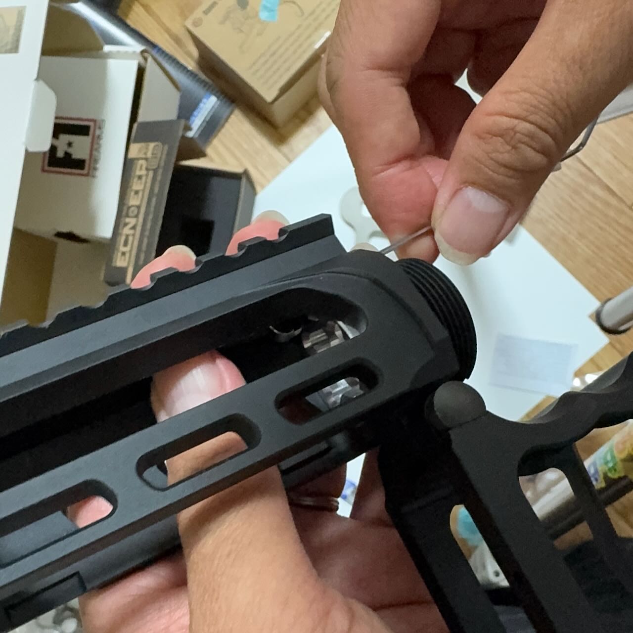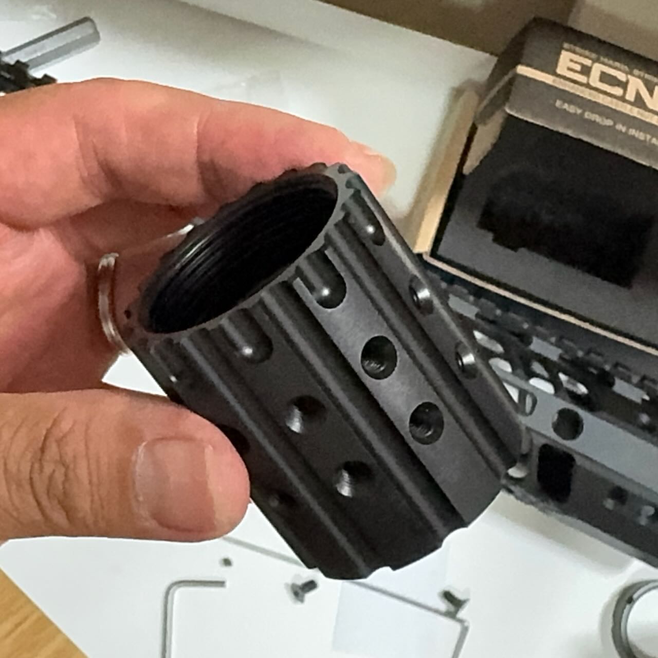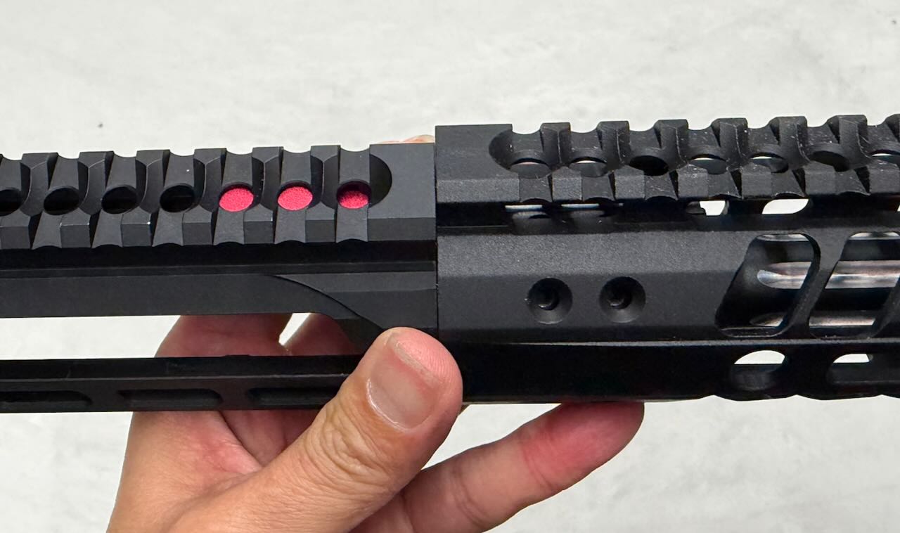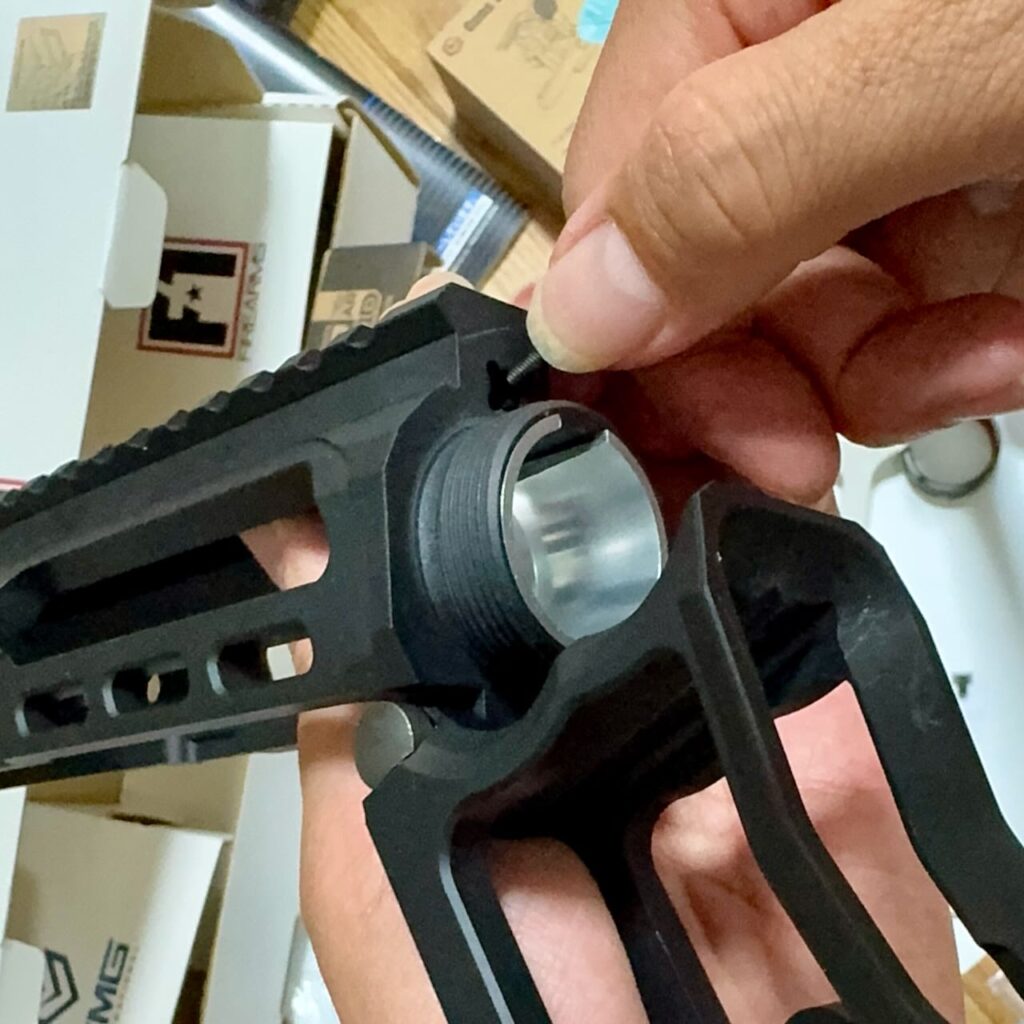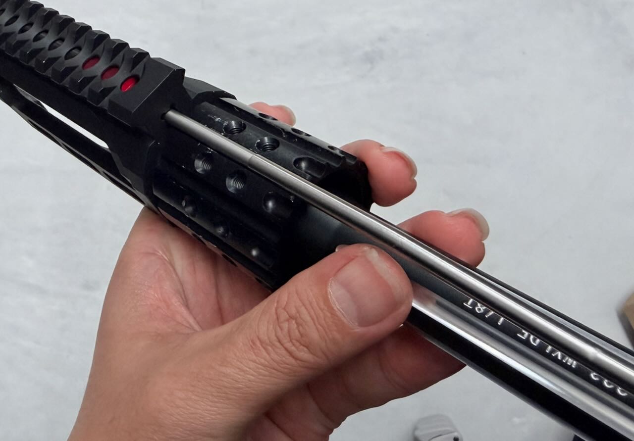 このバレルナットは片側がミリ規格、反対側がインチ規格のネジになってるリバーシブル仕様。今回のレシーバーはインチ規格なのでバレルナット外周にくぼみがない側でバレルとレシーバを締める。バレルナットの向きに注意してサクッと締めて、とりあえずハンドガードも差し込んで雰囲気確認。