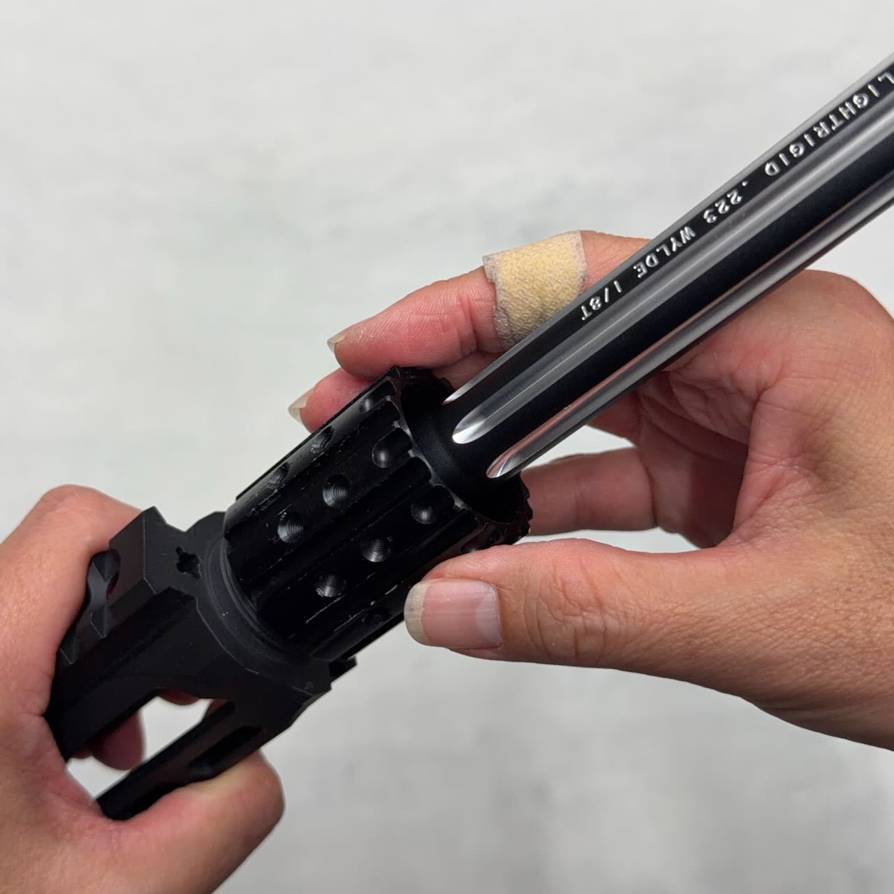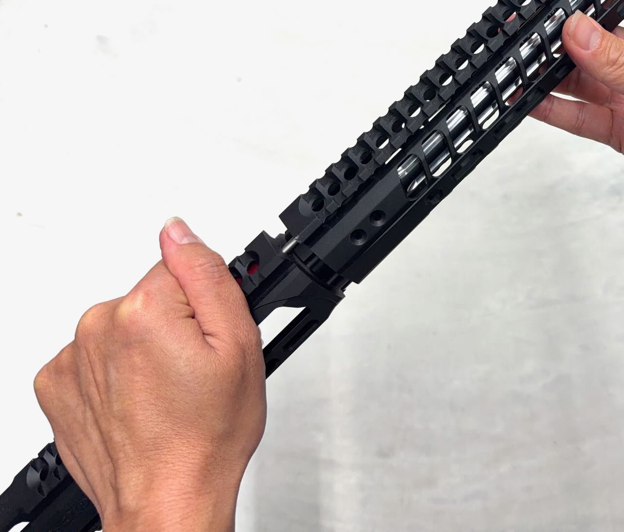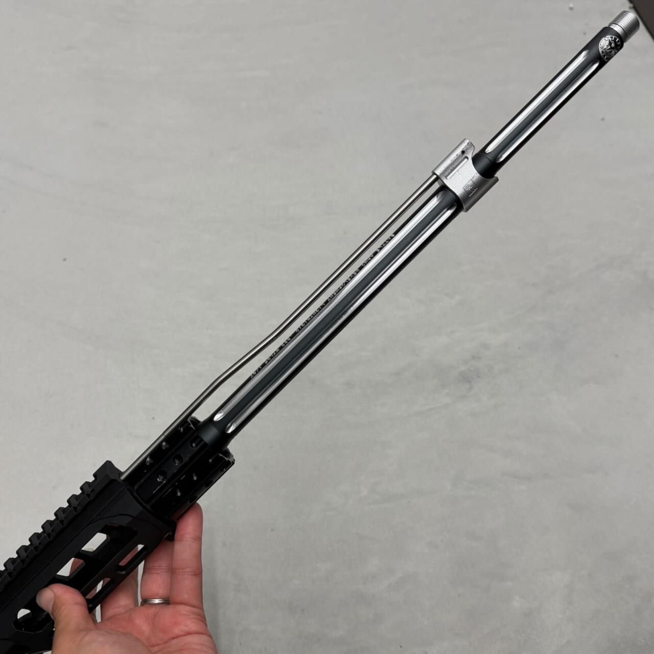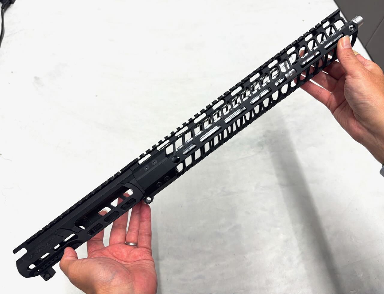このバレルナットは片側がミリ規格、反対側がインチ規格のネジになってるリバーシブル仕様。今回のレシーバーはインチ規格なのでバレルナット外周にくぼみがない側でバレルとレシーバを締める。バレルナットの向きに注意してサクッと締めて、とりあえずハンドガードも差し込んで雰囲気確認。