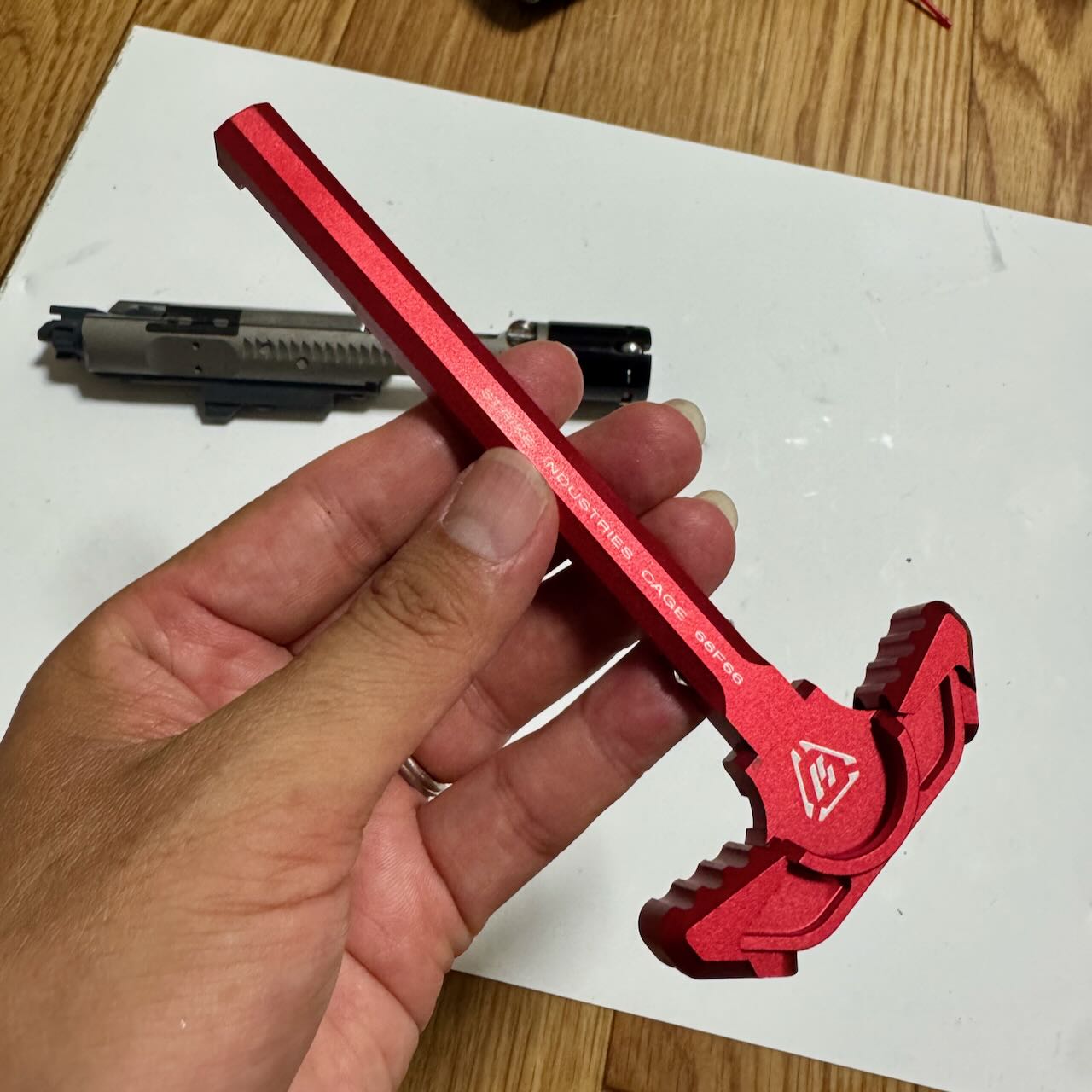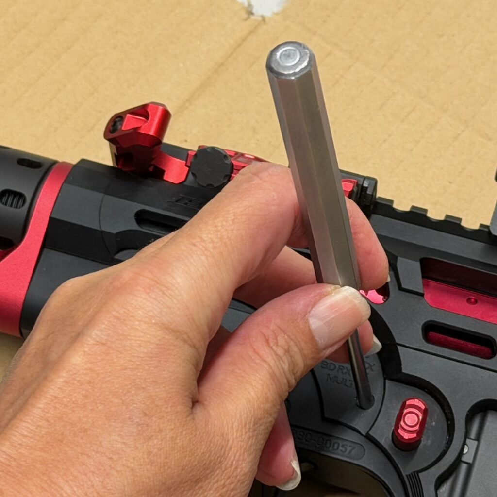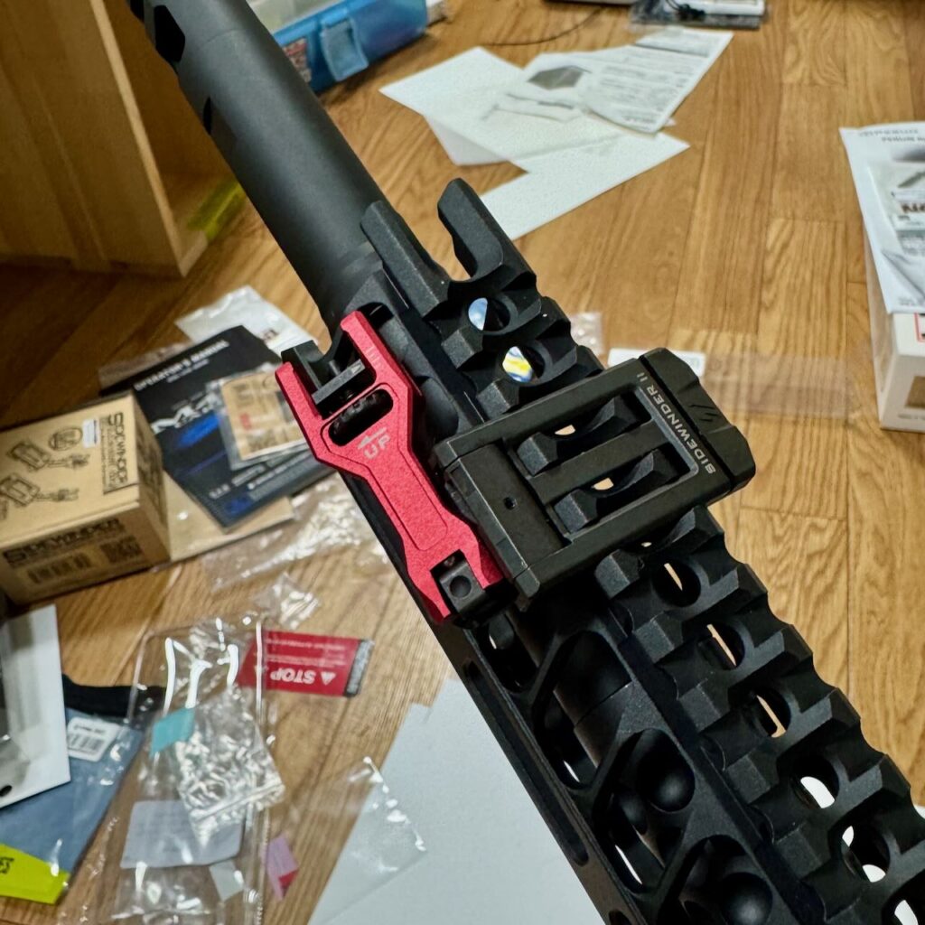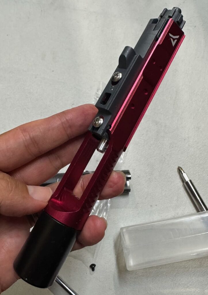 側面に出っ張りがなく色はメタリックレッドという都合のいいチャージングハンドルが・・・あった。5KUの SIタイプ ラッチレスチャージングハンドル RED。取り付けは簡単。ボルトに乗せてアッパーレシーバーの後ろから入れるだけ。