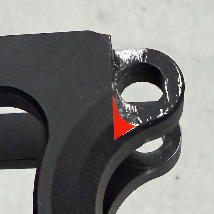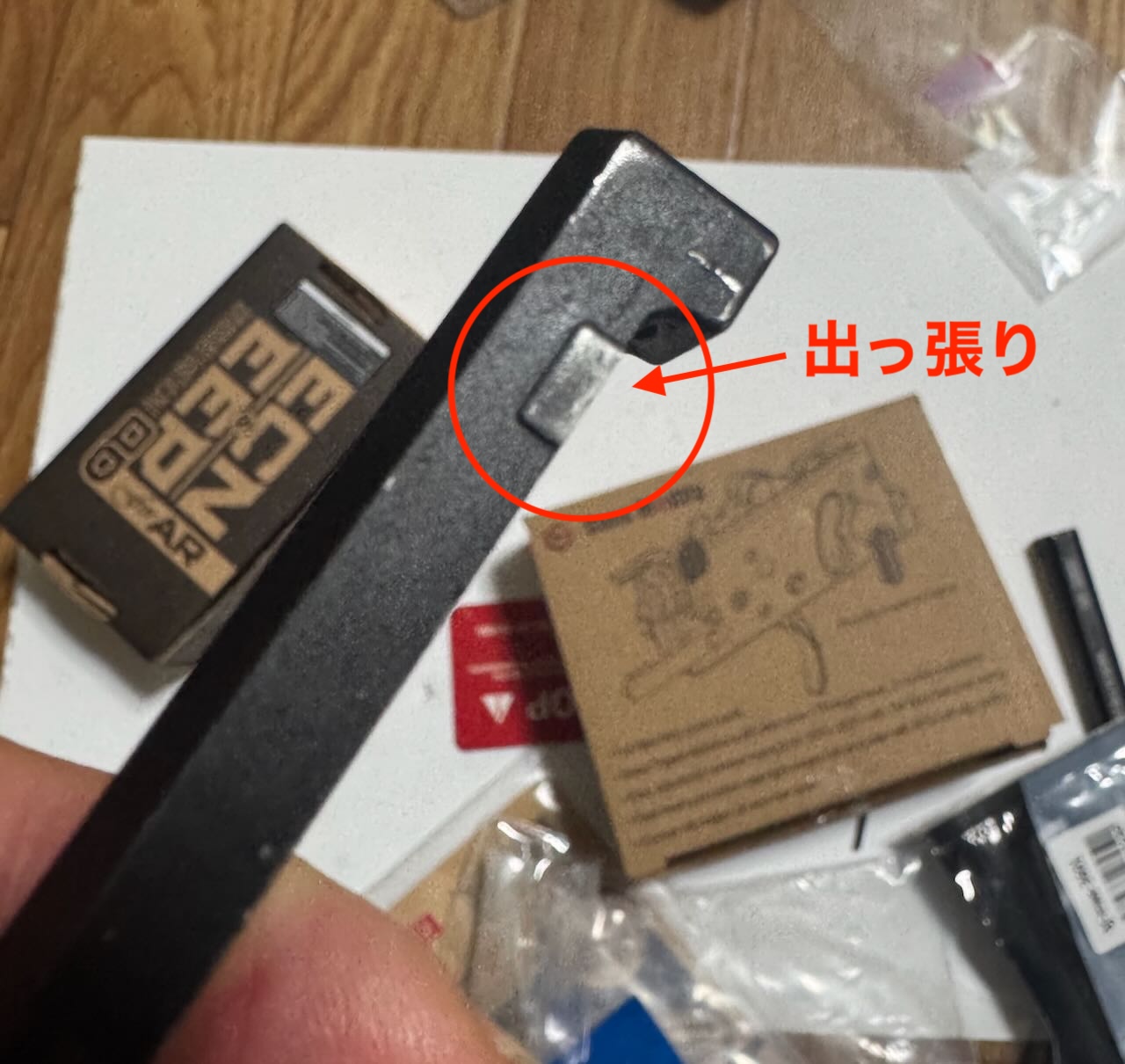 マガジンキャッチの問題は、マガジンを引っ掛ける出っ張り部分の位置が上へズレているんだろうということは容易に想像できる。取り外して純正パーツと比較してみるとやはりそうだった。