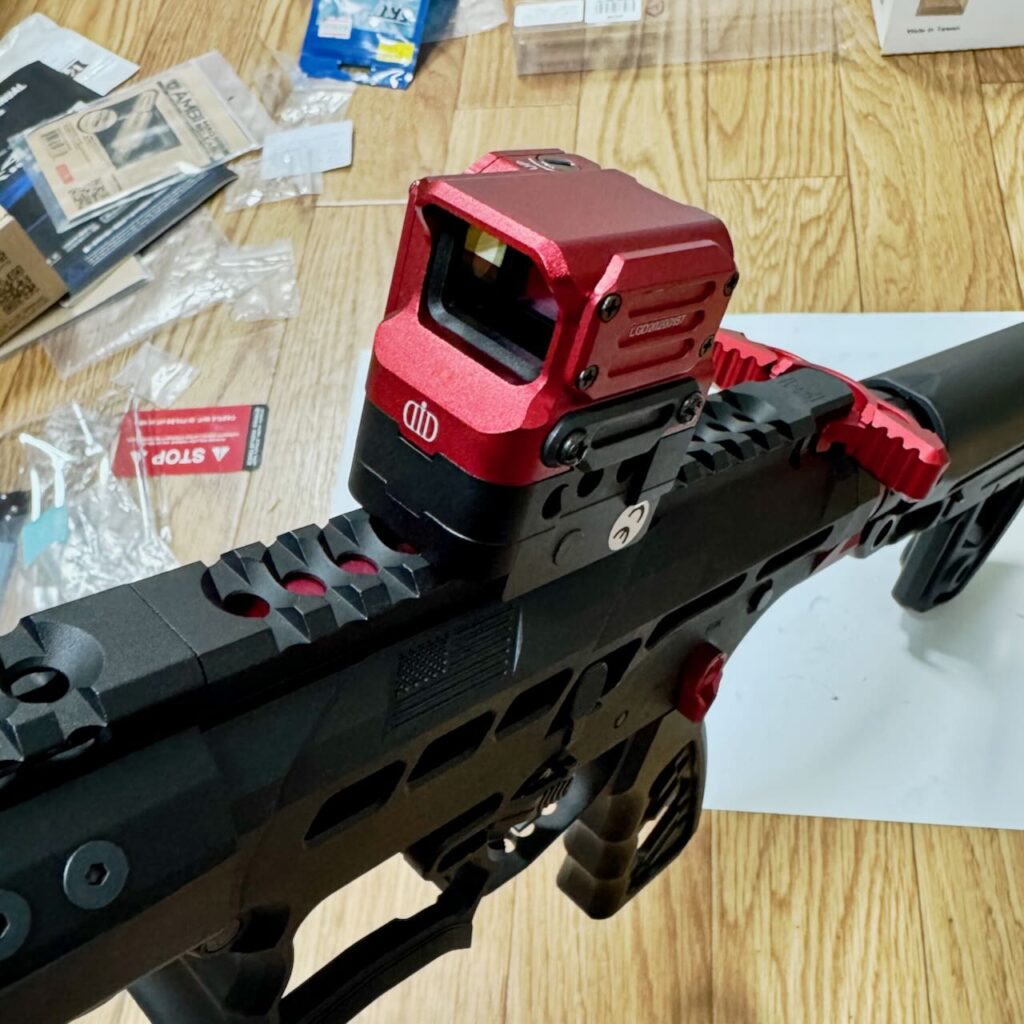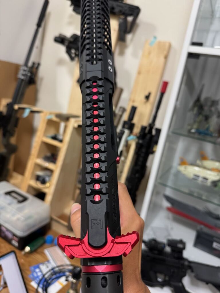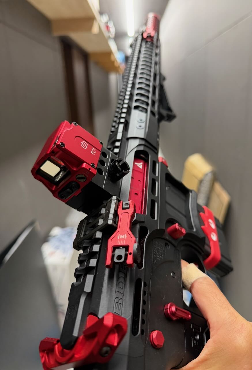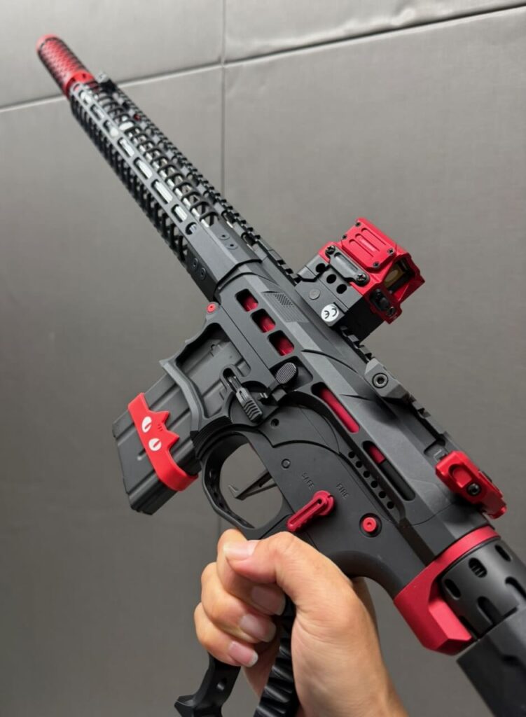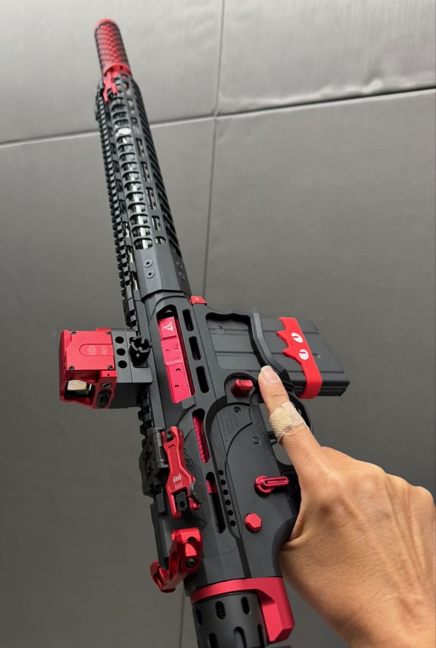 F1 Firearms のスケスケレシーバー、スケスケハンドガード、スケスケグリップを核にしてメタリックレッドをアクセントカラーに競技用・スポーツ用っぽいシュッとしたM4系ライフルが完成。