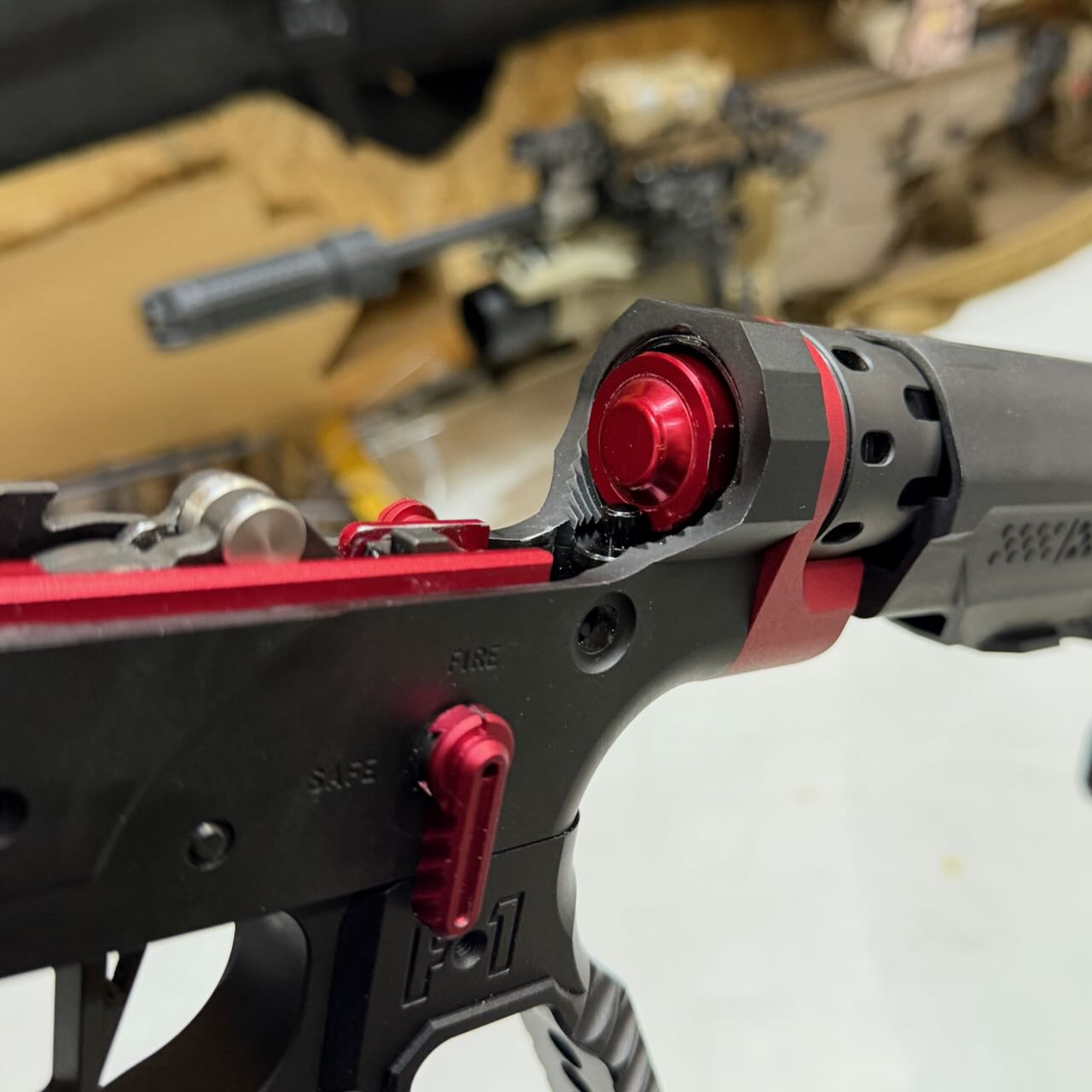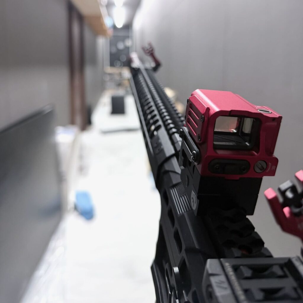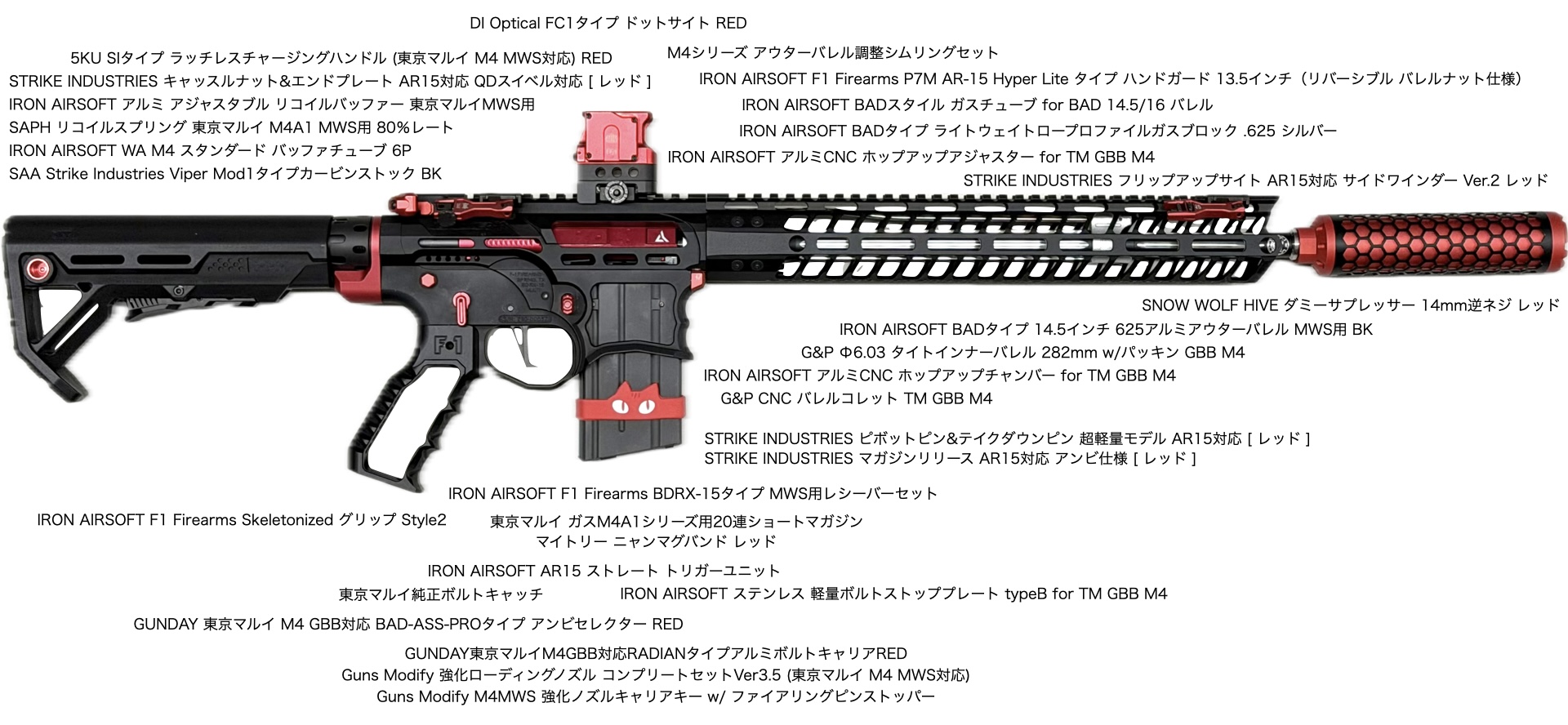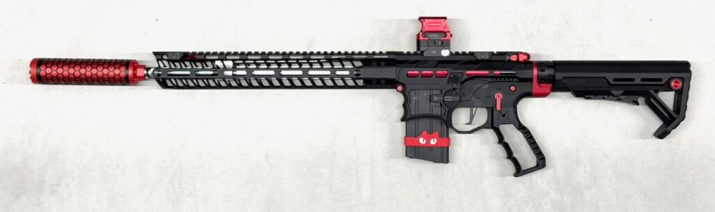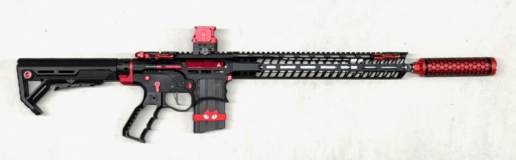 F1 Firearms のスケスケレシーバー、スケスケハンドガード、スケスケグリップを核にしてメタリックレッドをアクセントカラーに競技用・スポーツ用っぽいシュッとしたM4系ライフルが完成。