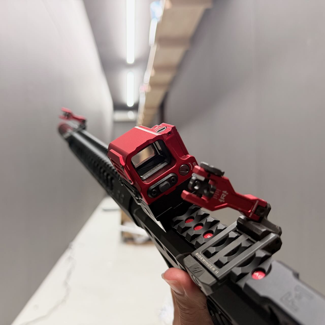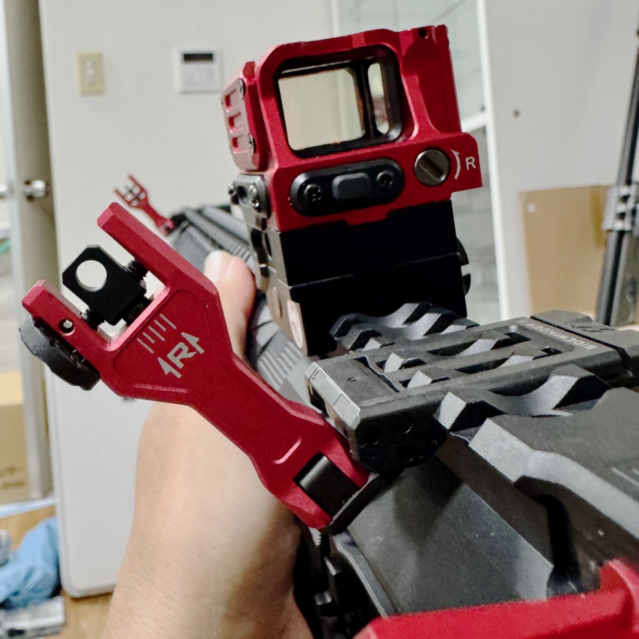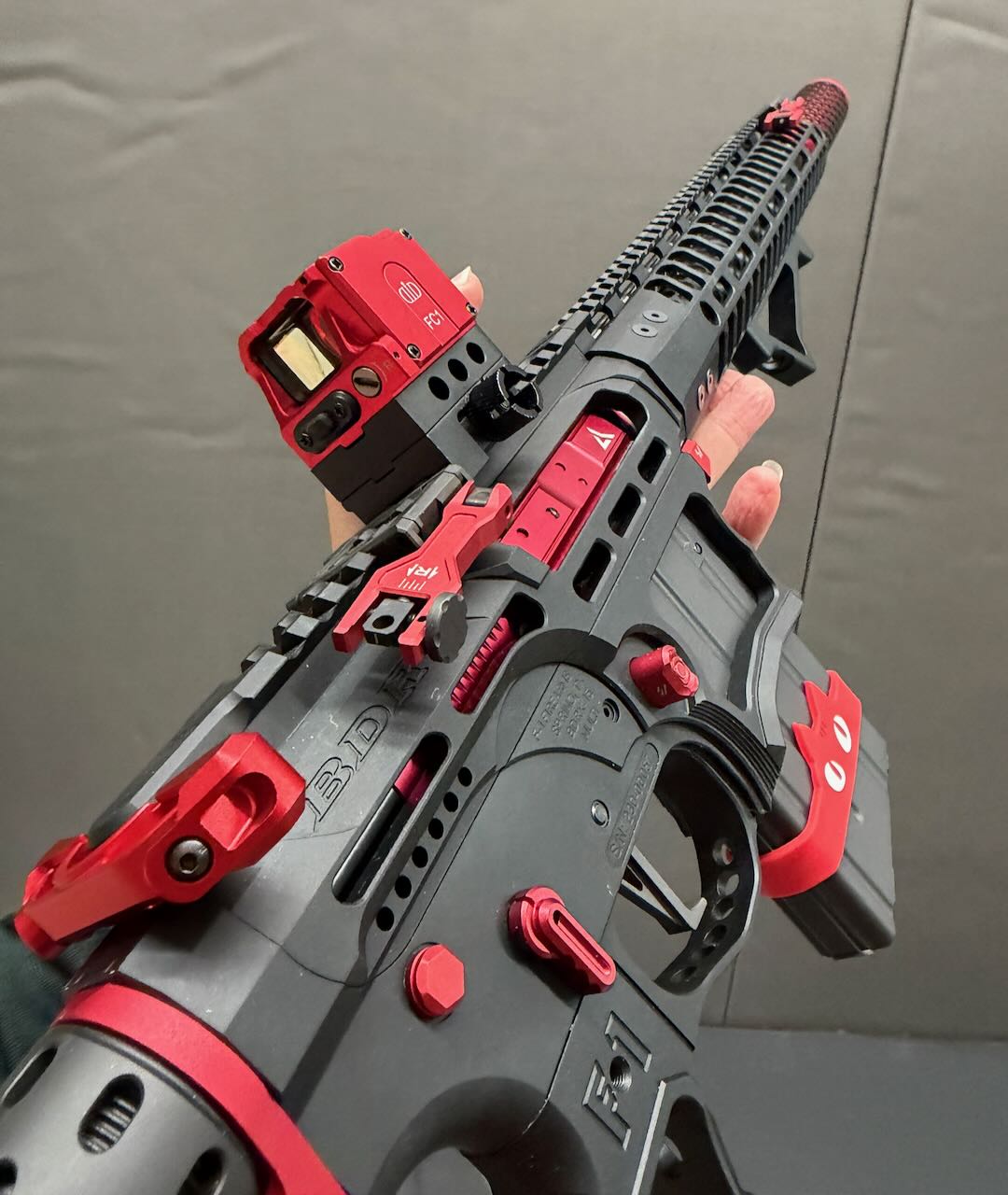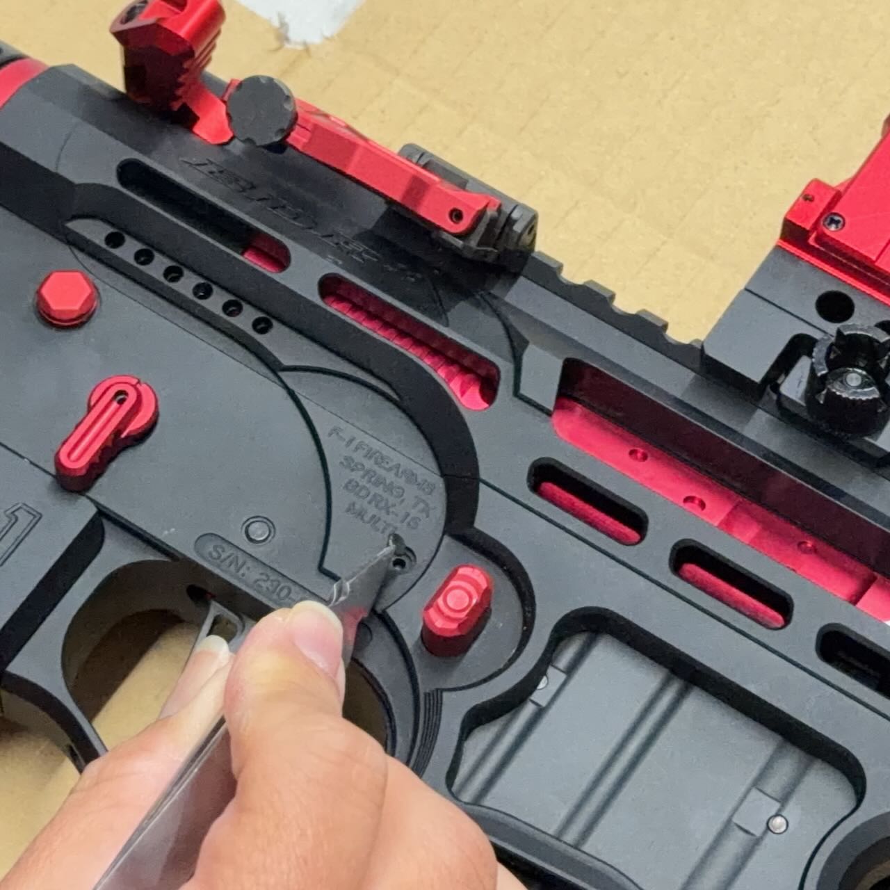 F1 Firearms のスケスケレシーバー、スケスケハンドガード、スケスケグリップを核にしてメタリックレッドをアクセントカラーに競技用・スポーツ用っぽいシュッとしたM4系ライフルが完成。