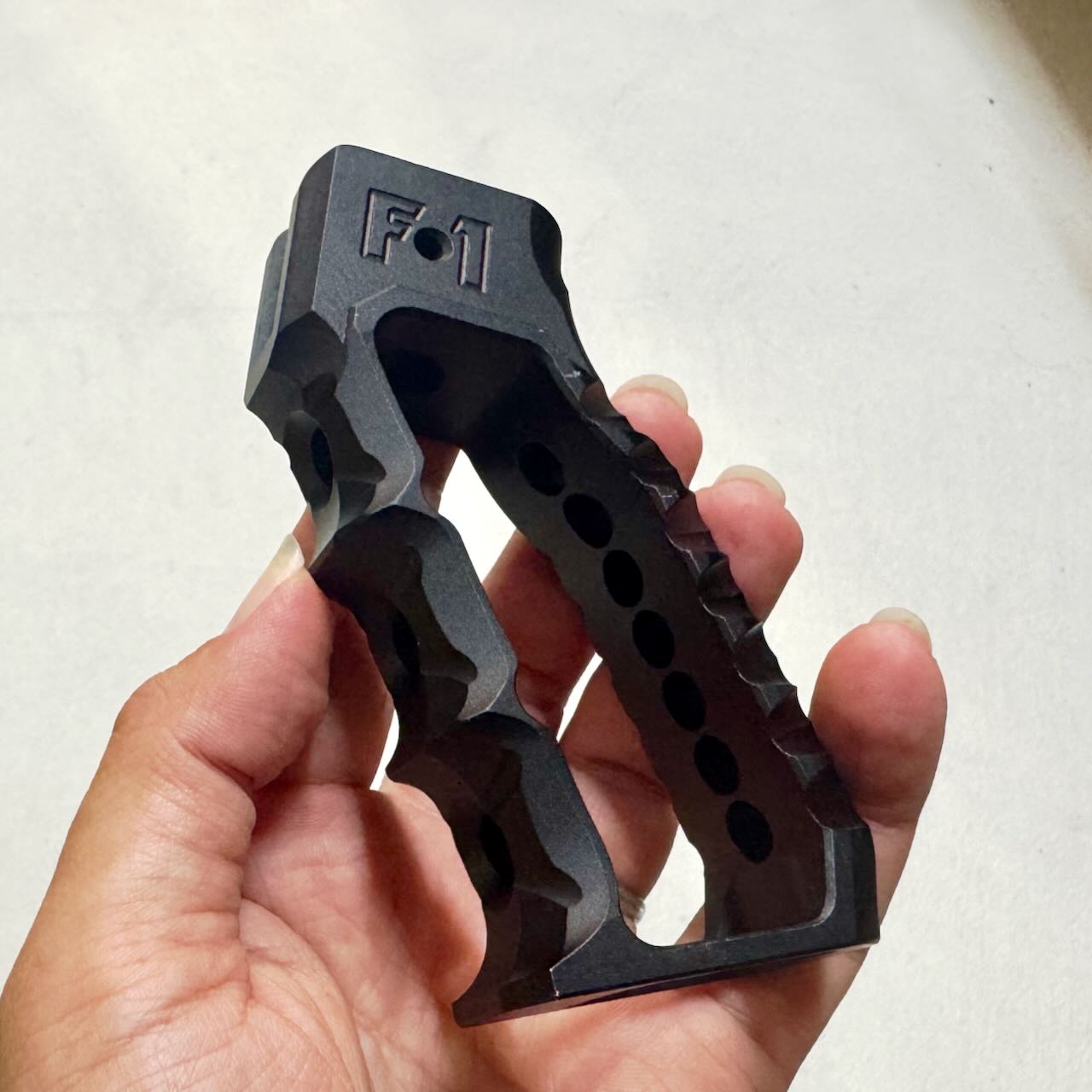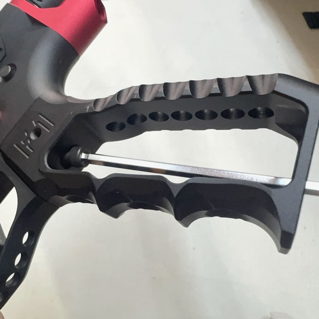 スケスケ IRON AIRSOFT F1 Firearms Skeletonized グリップ Style2。取り付けは簡単。付属のネジでグリップの中からレシーバーに向かって締め込めば終わり。スケスケェ〜