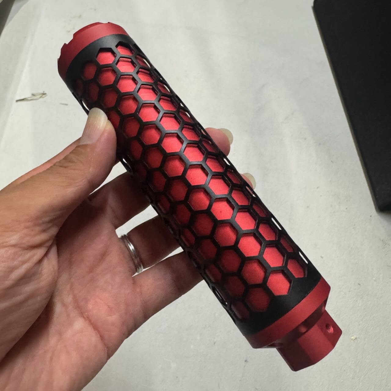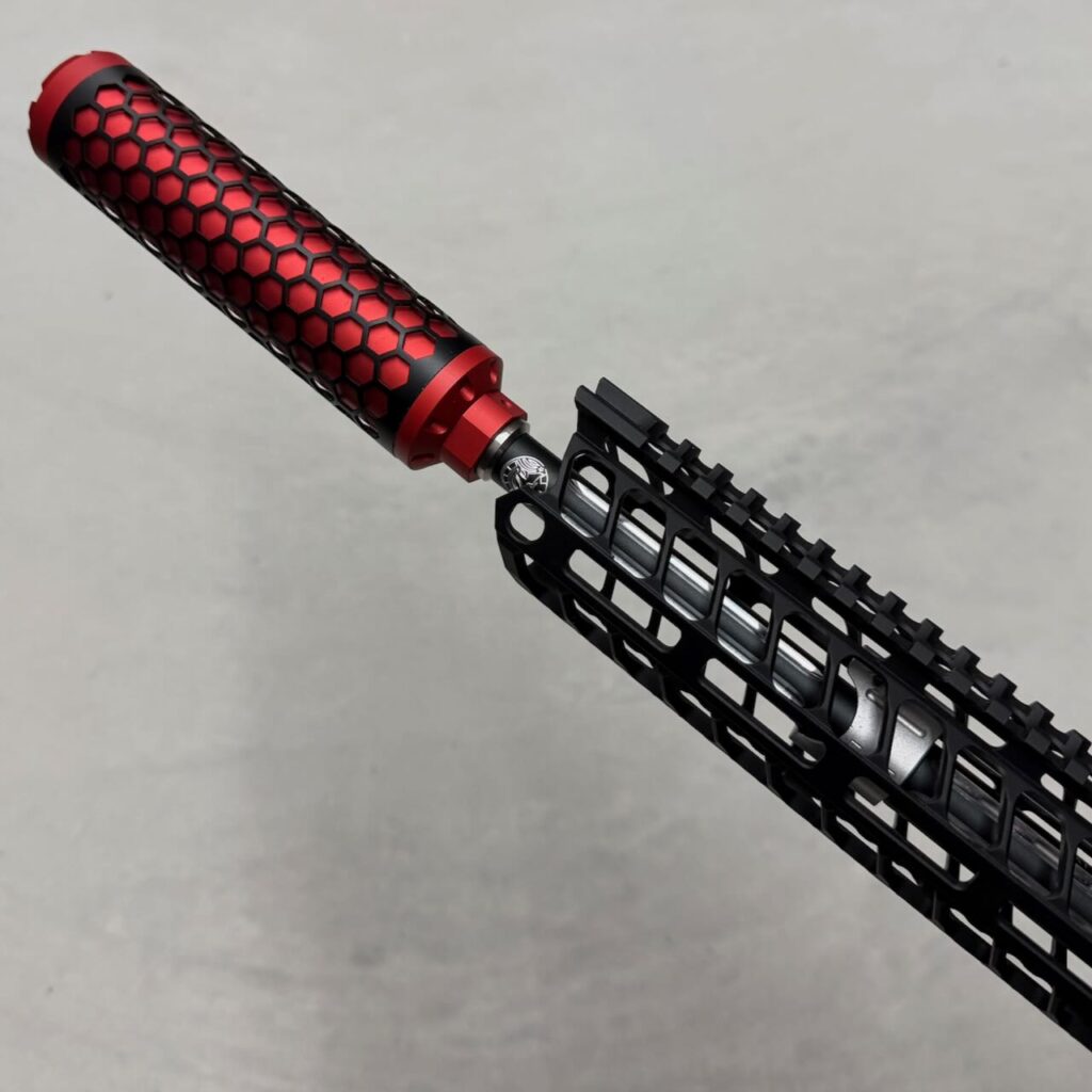 SNOW WOLFのHIVE ダミーサプレッサー RED。Hive(ハチの巣)のような六角形の穴が空いた外装デザインが特徴。ダミーなので中は空洞で消音効果はまったくない完全なるアクセサリー。