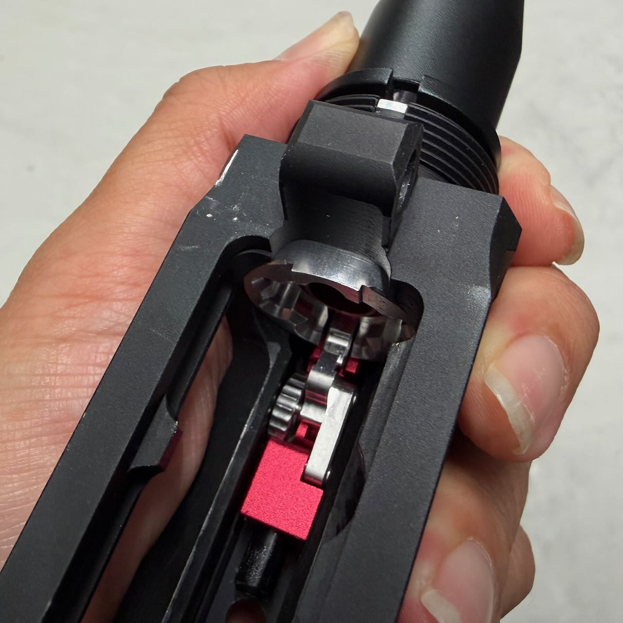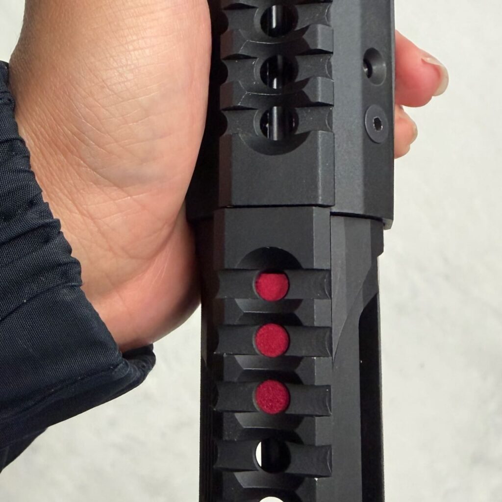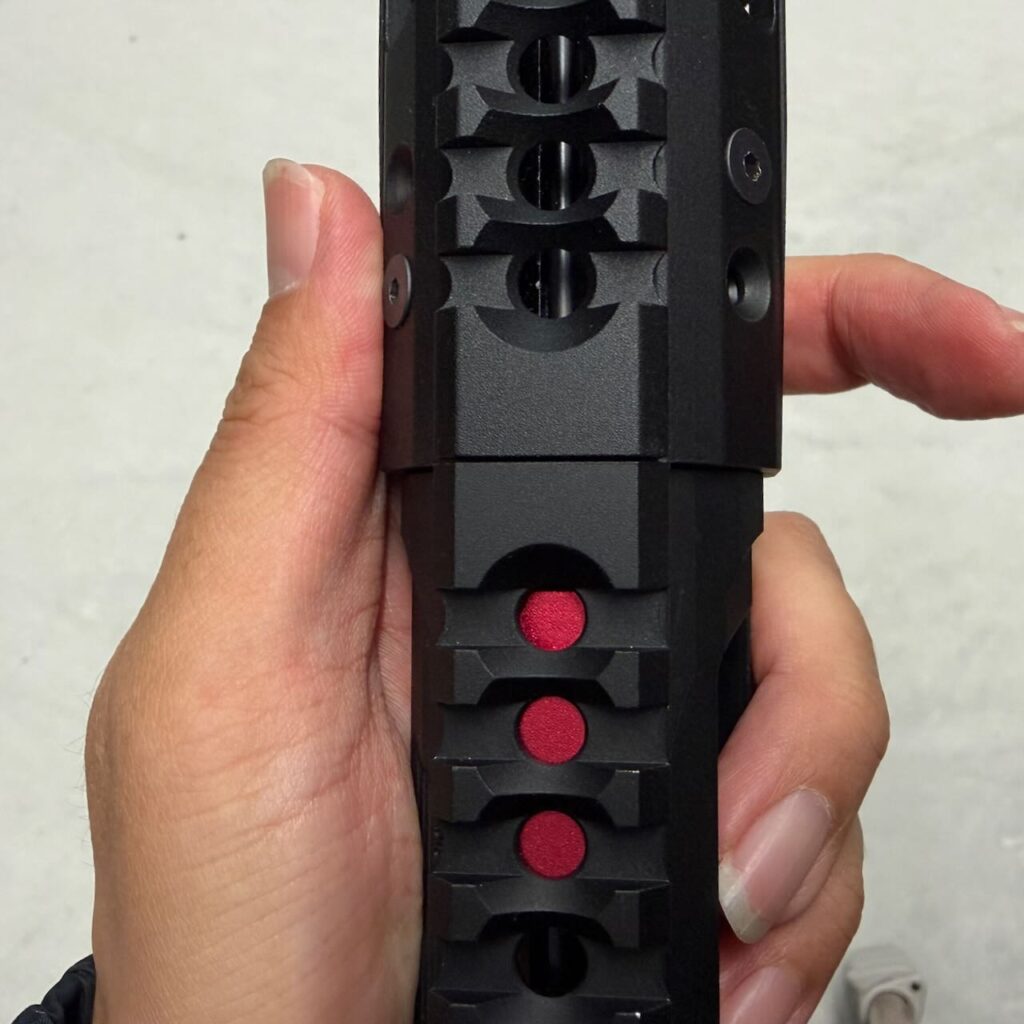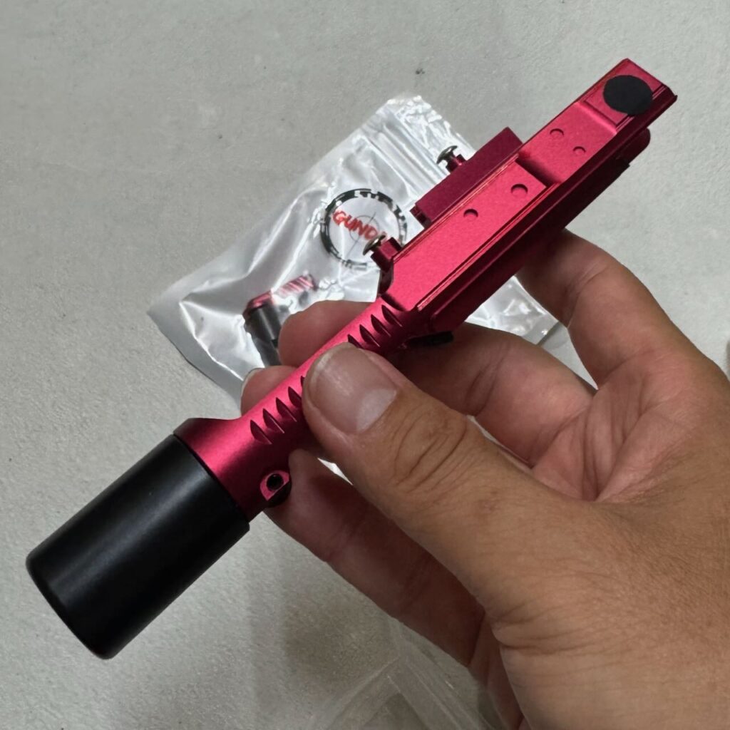 ホップアジャスター本体のメタリックレッドがトップレールに空いてる穴から見える。スケスケレシーバーのオシャレポイント。