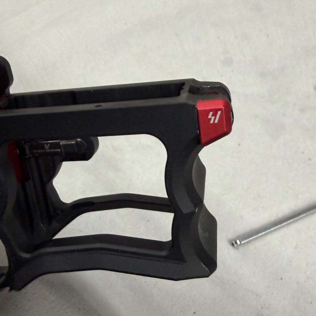 STRIKE INDUSTRIES マガジンリリース AR15対応 アンビ仕様 [ レッド ]。マガジンキャッチレバーを左側から挿し、右側からスプリングを入れて、マガジンキャッチボタンをクルクルっとねじ込む。ロアレシーバーにぶつかるところまで入れたら左側へ向かってググッと目一杯押し込む。右側に飛び出したレバーを反時計回りに2回転締めれば終わり。