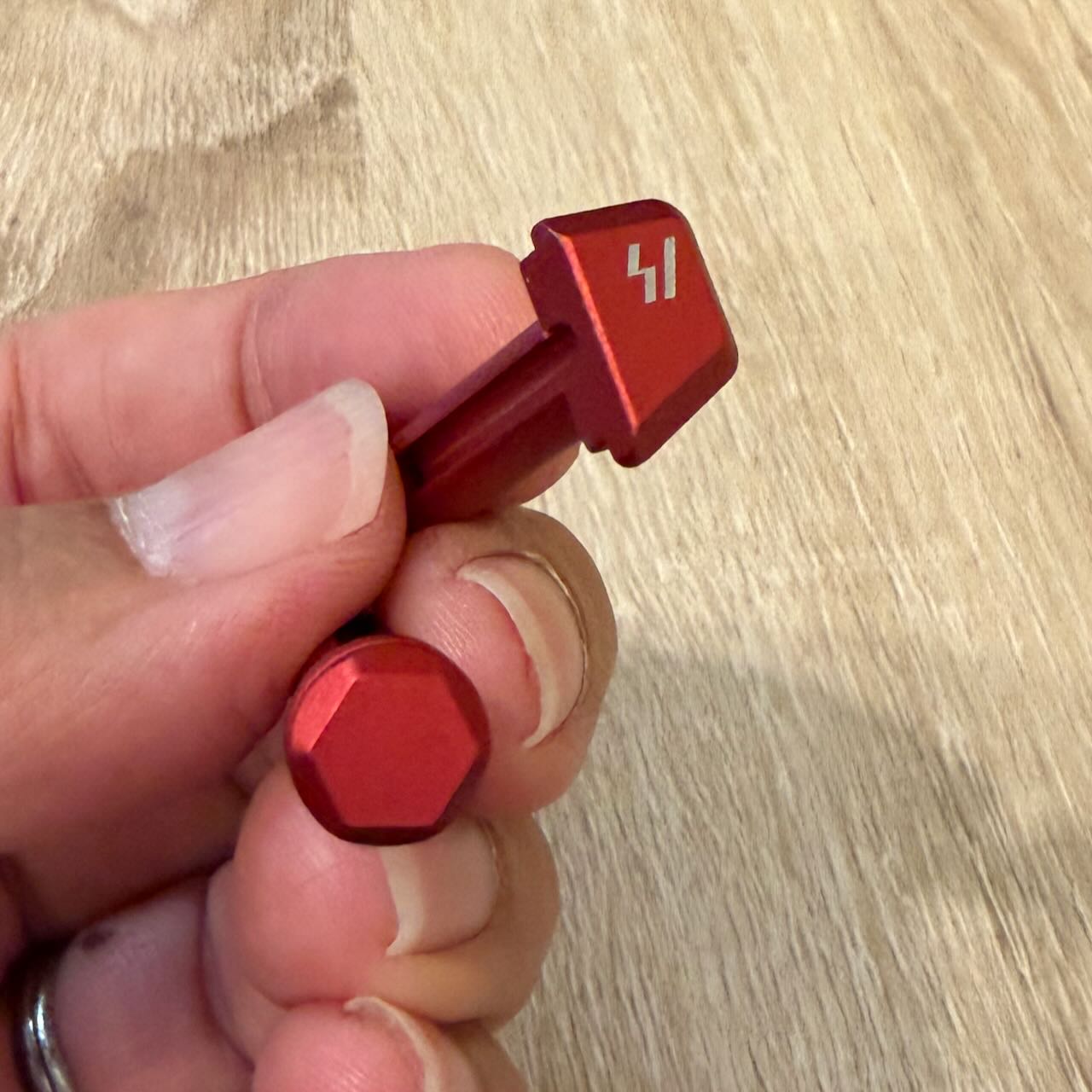 STRIKE INDUSTRIES 超軽量ピボット&テイクダウンピン RED。レシーバー付属のピボットピンは一般的なM4のピボットピンと同じく頭が円形の一部を真っ直ぐ切り取った形をしていてレシーバーはこのピン頭を包むように下側が張り出している。