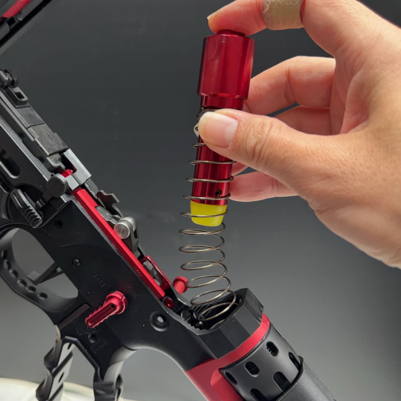 赤いバッファにしたいというだけの理由で IRON AIRSOFT アルミCNC アジャスタブルバッファ を採用。ボルトキャリアがアルミ製で軽くなっているから代わりにバッファには付属のオモリを全部入れて重くしてみる。リコイルスプリングは対純正比80%の少し柔らかいSAPH リコイルスプリング 東京マルイ M4A1 MWS用 80%レートにして、バッファーチューブの中に入れる。