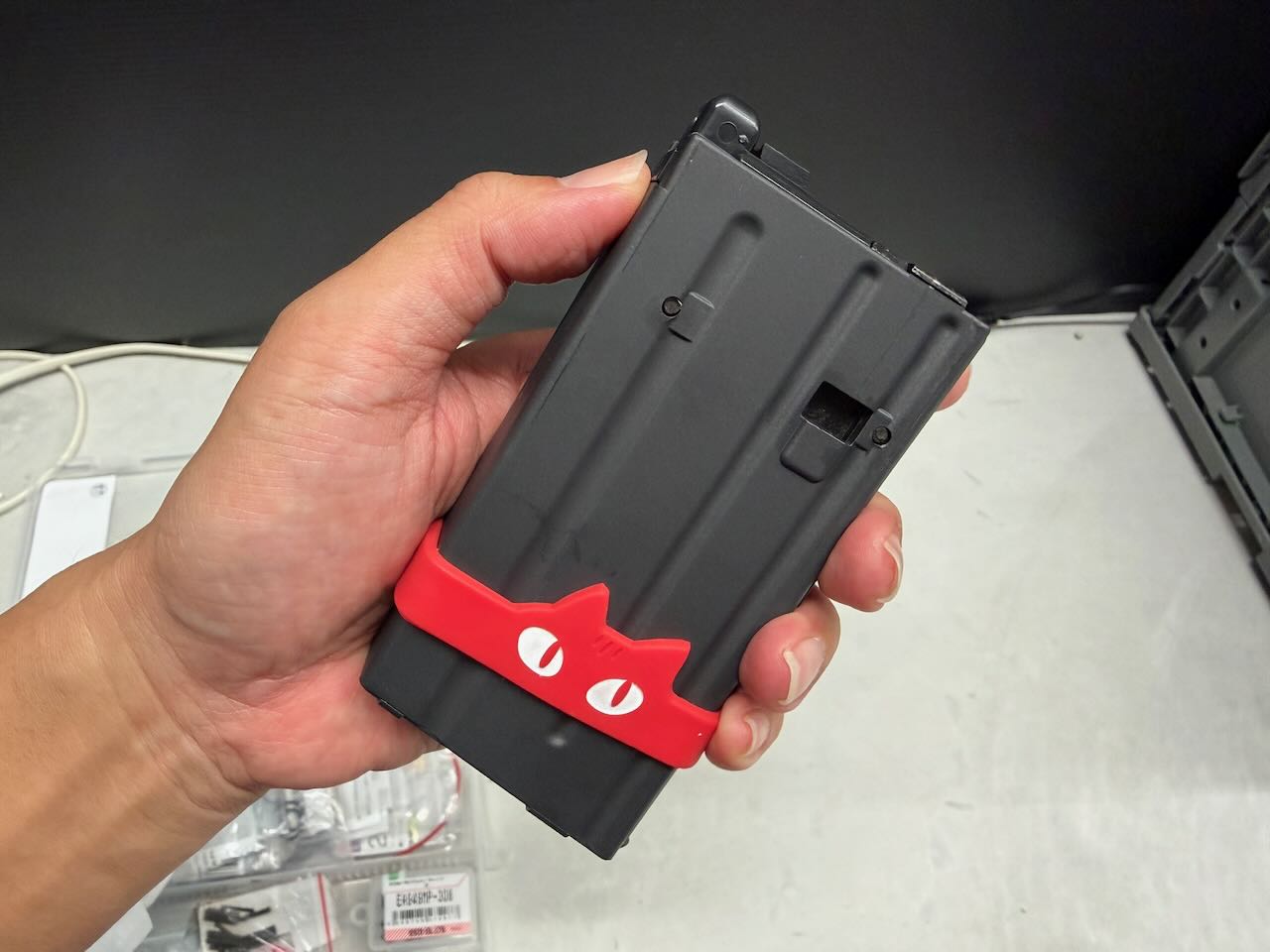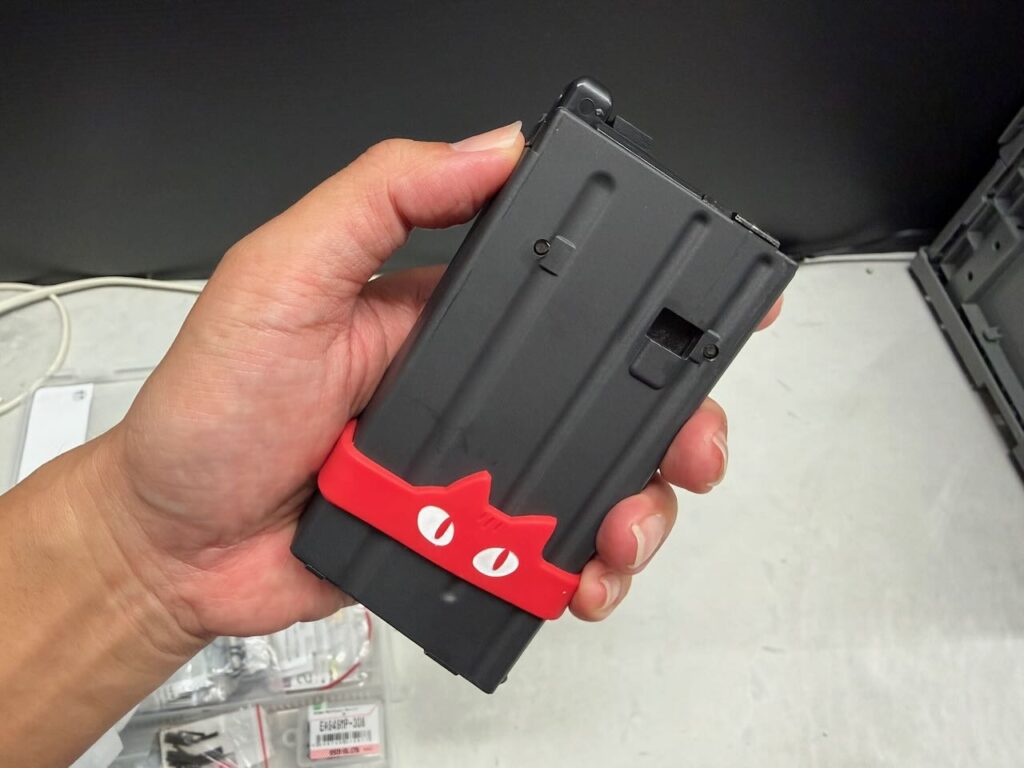 赤いマグバンドでしかもネコさんの MAITRI ニャンマグバンド レッド。なんというすばらしい組み合わせ。エアガンショップで偶然見つけて即買い。ちなみにマガジンはシュッとした外観に合わせて東京マルイのガスM4A1シリーズ用20連ショートマガジン。