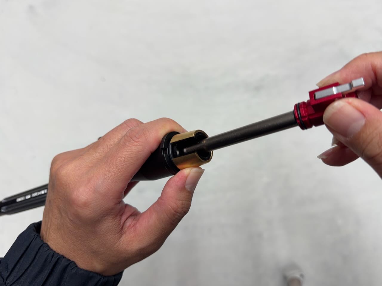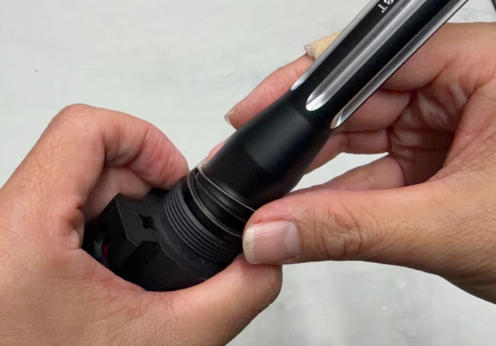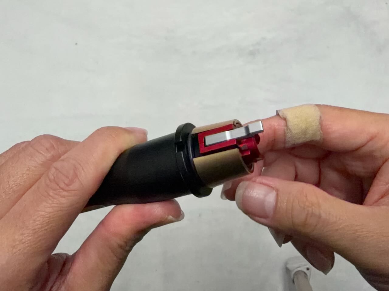 トリガーピンの溝が右側になる向きでトリガーカラーに挿し込む。ちょうどいい位置まで差し込むとトリガーユニットの中にあるリングがトリガーピンの溝にカチッとハマる感覚がある。