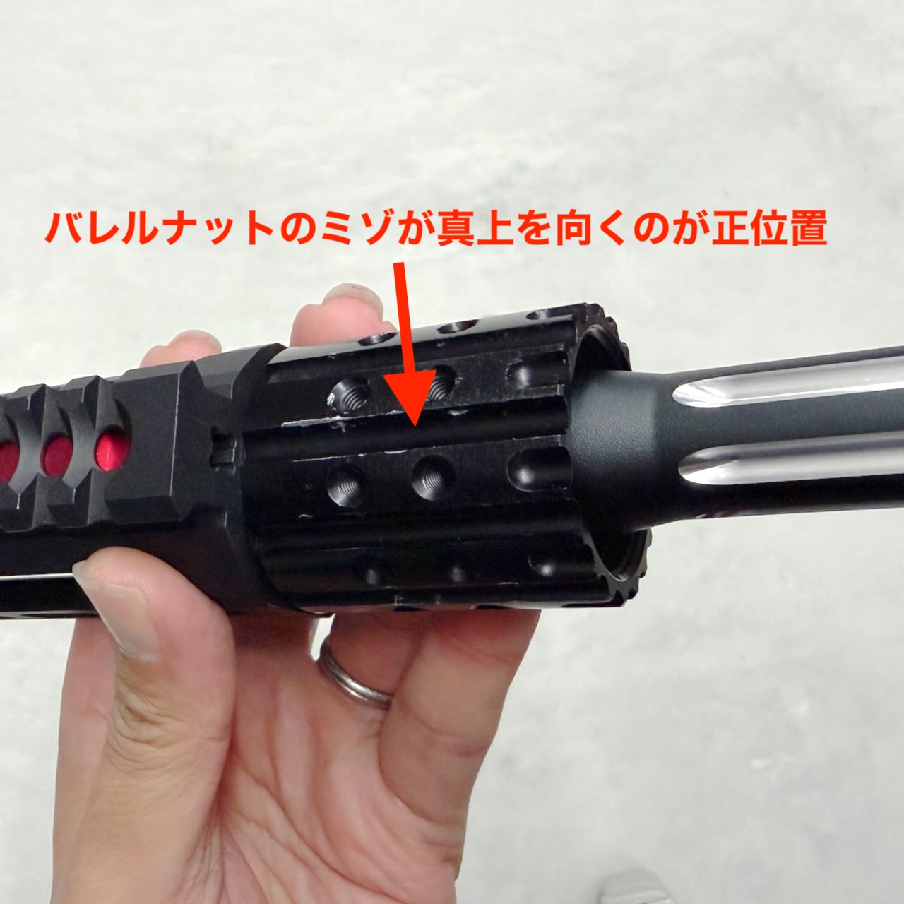 ここからはちょっと面倒くさい位置調整。このハンドガードはバレルナット側面のネジ穴を使って固定する。そのため、バレルナットを完全に締めた状態でのネジ穴の向きが中途半端だと上の写真のようにハンドガードの真上がズレてしまう。