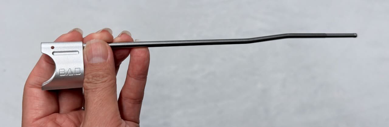 今回のBADタイプアウターバレルはガスブロック取り付け部の直径が0.625インチの細身なので、ガスブロックもそれに対応した IRON AIRSOFT BAD タイプ 625 ロープロファイルガスブロック Silverにした。ガスチューブには IRON AIRSOFT BAD スタイル ガスチューブ for BAD 14.5/16 バレル を取り付ける。