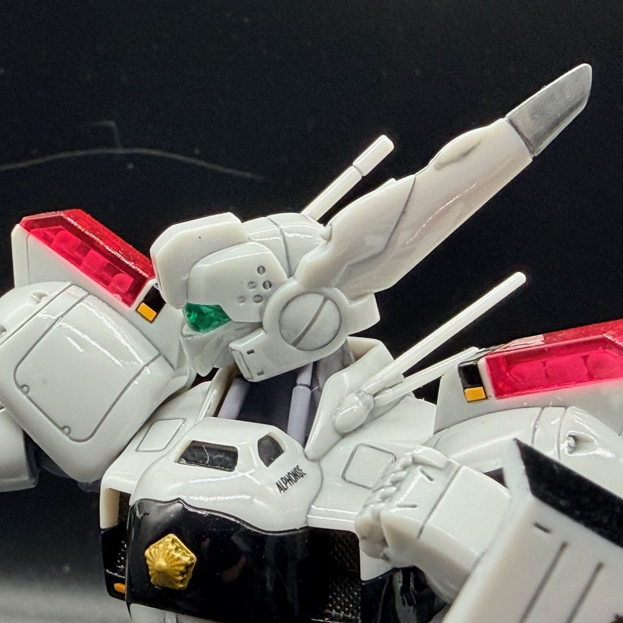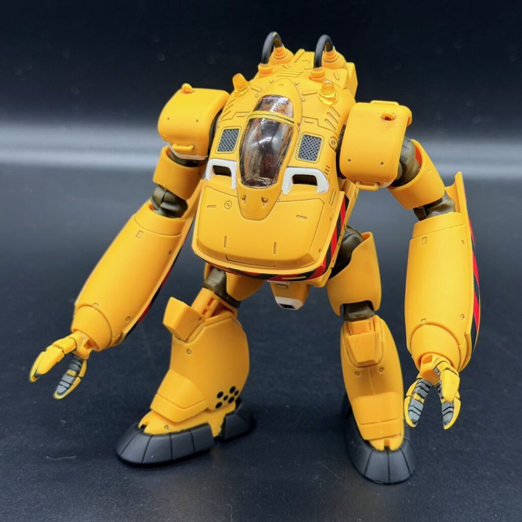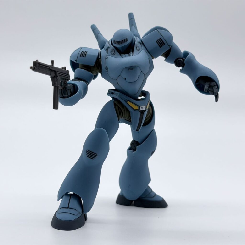 外装は足首の裏側のパネルみたいなものを筆塗りで塗装した程度で、あとはエナメルグレーで墨入れ。デカールを貼ったら、パトカーに準ずる警察車両のイメージなので水性トップコート<光沢>で仕上げてる。
