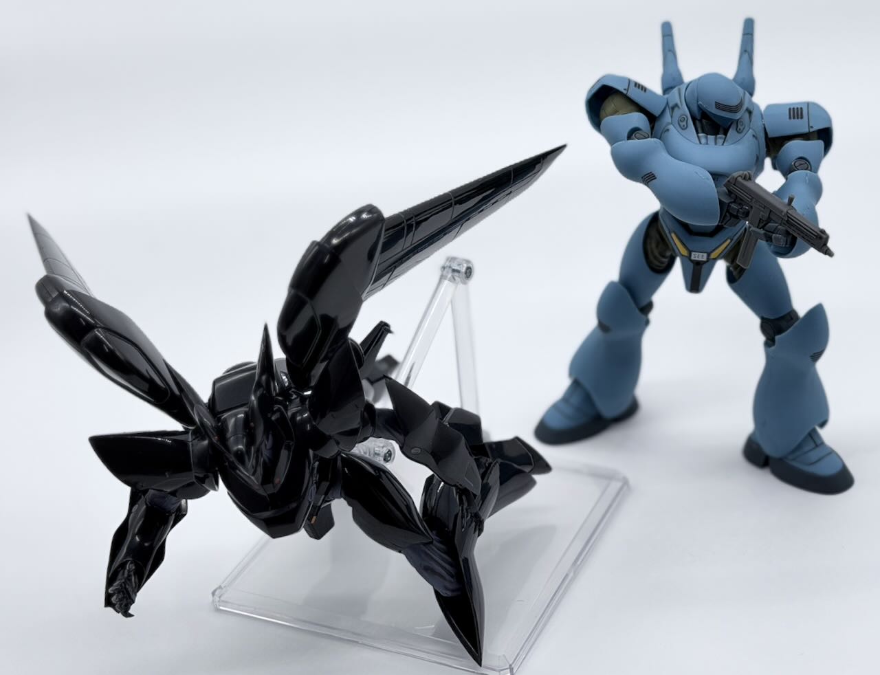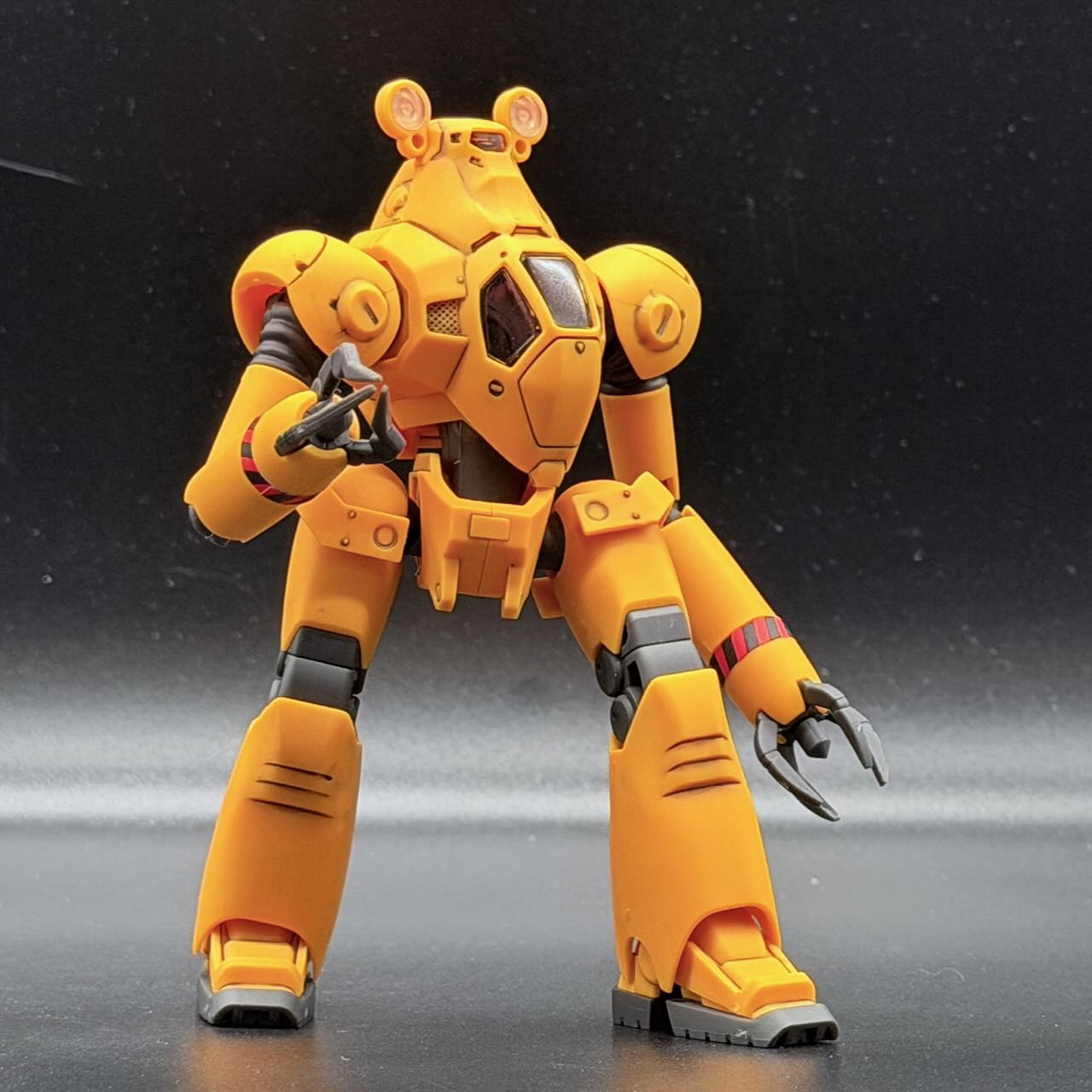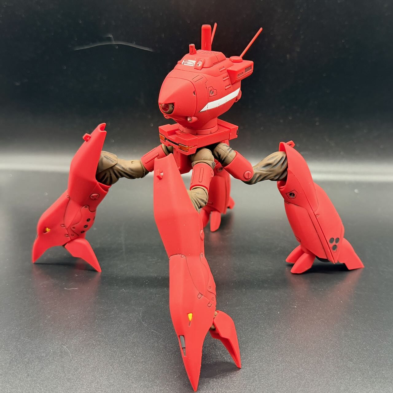 外装は足首の裏側のパネルみたいなものを筆塗りで塗装した程度で、あとはエナメルグレーで墨入れ。デカールを貼ったら、パトカーに準ずる警察車両のイメージなので水性トップコート<光沢>で仕上げてる。